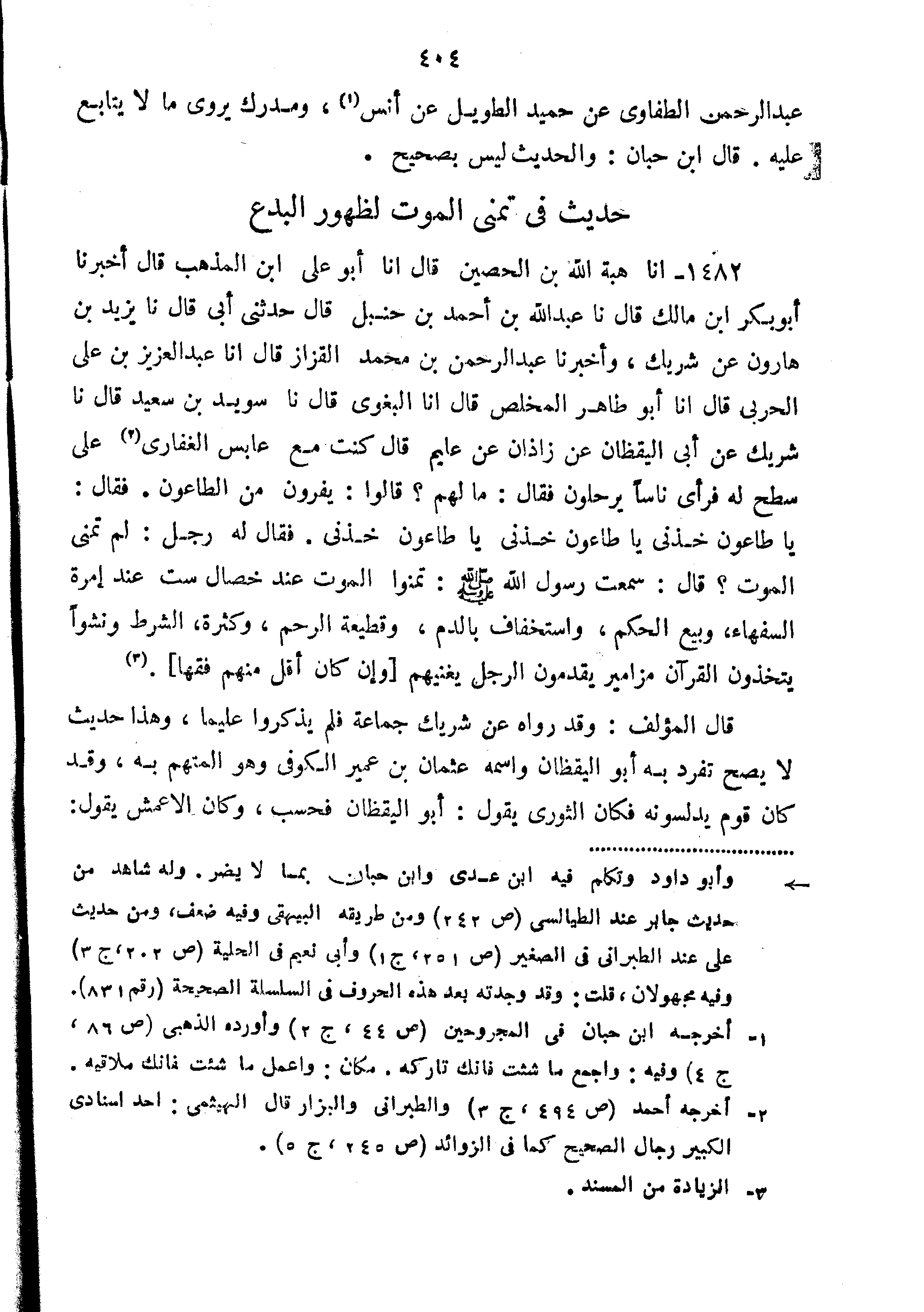1482-أَنَا هِبَةُ اللَّهِ بْنُ الْحُصَيْنِ قَالَ أَنَا أَبُو عَلِيِّ بْنُ الْمُذْهِبِ قَالَ أَخْبَرَنَا أَبُو بَكْرِ بْنُ مَالِكٍ قَالَ نا عَبْدُ اللَّهِ بْنُ أَحْمَدَ بْنِ حَنْبَلٍ قَالَ حَدَّثَنِي أبي قال نا يزيد ابن هَارُونَ عَنْ شَرِيكٍ وَأَخْبَرَنَا عَبْدُ الرَّحْمَنِ بْنُ مُحَمَّدٍ الْقَزَّازُ قَالَ أَنَا عَبْدُ الْعَزِيزِ بْنُ عَلِيٍّ الْحَرْبِيُّ قَالَ أَنَا أَبُو طَاهِرٍ الْمُخَلِّصُ قَالَ أَنَا الْبَغَوِيُّ قَالَ نا سُوَيْدُ بْنُ سَعِيدٍ قَالَ نا شَرِيكٌ عَنْ أَبِي الْيَقْظَانِ عَنْ زَاذَانَ عَنْ عُلَيْمٍ قَالَ كُنْتُ مَعَ عَابِسٍ الْغِفَارِيِّ عَلَى سَطْحٍ لَهُ فَرَأَى نَاسًا يَرْحَلُونَ فَقَالَ مَا لَهُمْ قَالُوا يَفِرُّونَ مِنَ الطَّاعُونِ فَقَالَ يَا طَاعُونُ خُذْنِي يَا طَاعُونُ خُذْنِي يَا طَاعُونُ خُذْنِي فَقَالَ لَهُ رَجُلٌ لِمَ تَمَنَّي الْمَوْتَ قَالَ سَمِعْتُ رَسُولِ اللَّهِ صَلَّى اللَّهُ عَلَيْهِ وَسَلَّمَ " تَمَنَّوُا الْمَوْتَ عِنْدَ خِصَالٍ سِتٍّ عِنْدَ إِمْرَةِ السُّفَهَاءِ وَبَيْعِ الْحُكْمِ وَاسْتِخْفَافٍ بِالدَّمِ وَقَطِيعَةِ الرَّحِمِ وَكَثْرَةِ الشُّرَطِ وَنَشْوًا يَتَّخِذُونَ الْقُرْآنَ مَزَامِيرَ يُقَدِّمُونَ الرَّجُلَ يُغَنِّيهِمْ وَإِنْ كَانَ أَقَلَّ مِنْهُمْ فِقْهًا"