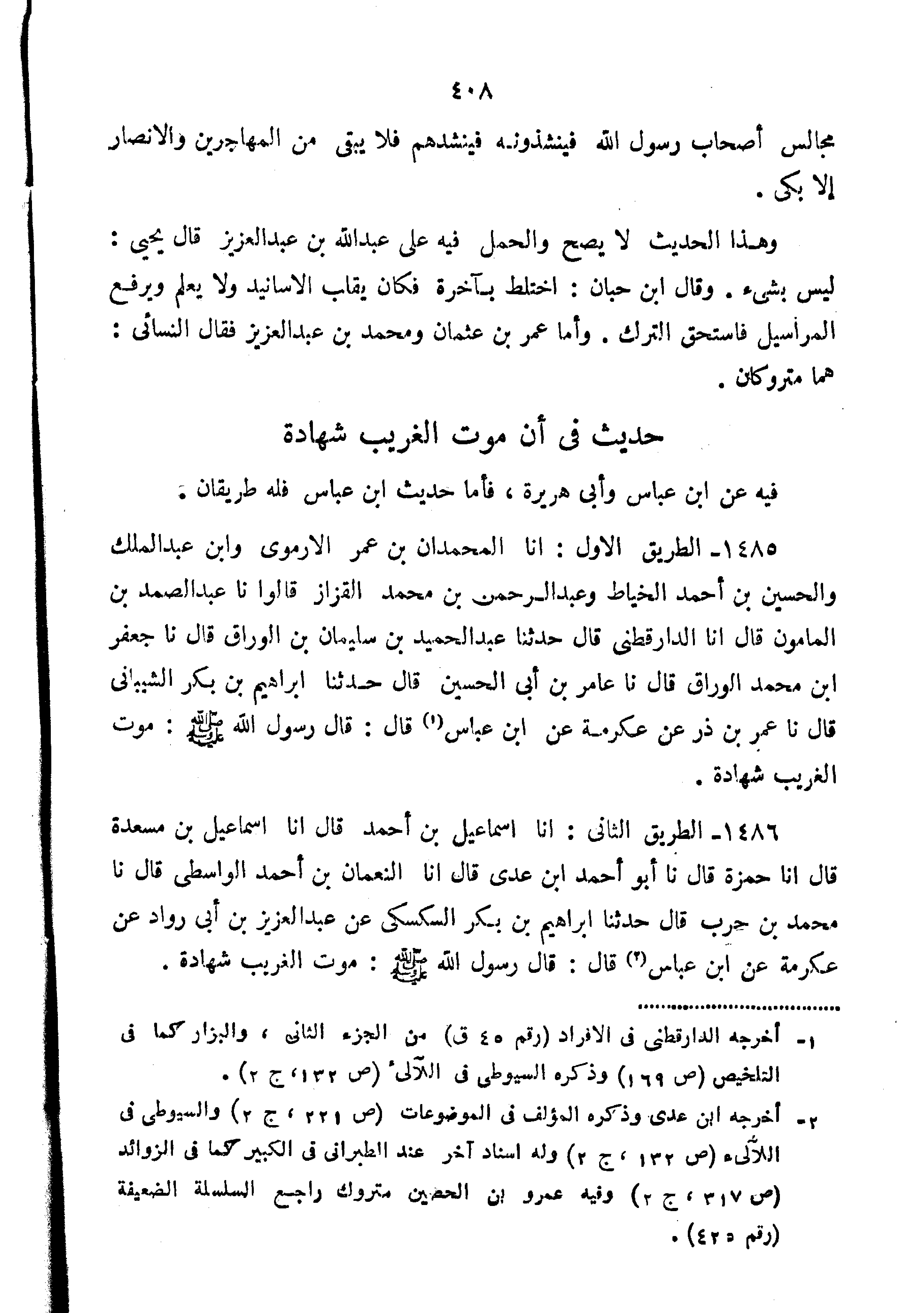 1485-الطَّرِيقُ الأَوَّلُ أَنَا الْمُحَمَّدَانِ ابْنُ عُمَرَ الأَرْمَوِيُّ وَابْنُ عَبْدِ الْمَلِكِ وَالْحُسَيْنُ بْنُ أَحْمَدَ الْخَيَّاطُ وَعَبْدُ الرَّحْمَنِ بْنُ مُحَمَّدٍ الْقَزَّازُ قَالُوا نا عَبْدُ الصَّمَدِ بْنُ الْمَأْمُونِ قَالَ أَنَا الدَّارَقُطْنِيُّ قَالَ حَدَّثَنَا عَبْدُ الْحَمِيدِ بْنُ سُلَيْمَانَ بْنِ الْوَرَّاقِ قَالَ نا جَعْفَرُ بْنُ مُحَمَّدٍ الْوَرَّاقُ قَالَ نا عَامِرُ بْنُ أَبِي الْحُسَيْنِ قَالَ حَدَّثَنَا إِبْرَاهِيمُ بْنُ بَكْرٍ الشَّيْبَانِيُّ قَالَ نا عُمَرُ بْنُ ذَرٍّ عَنْ عِكْرِمَةَ عَنِ ابْنِ عَبَّاسٍ قَالَ: قَالَ رَسُولُ اللَّهِ صَلَّى اللَّهُ عَلَيْهِ وَسَلَّمَ: "مَوْتُ الْغَرِيبِ شَهَادَةٌ"