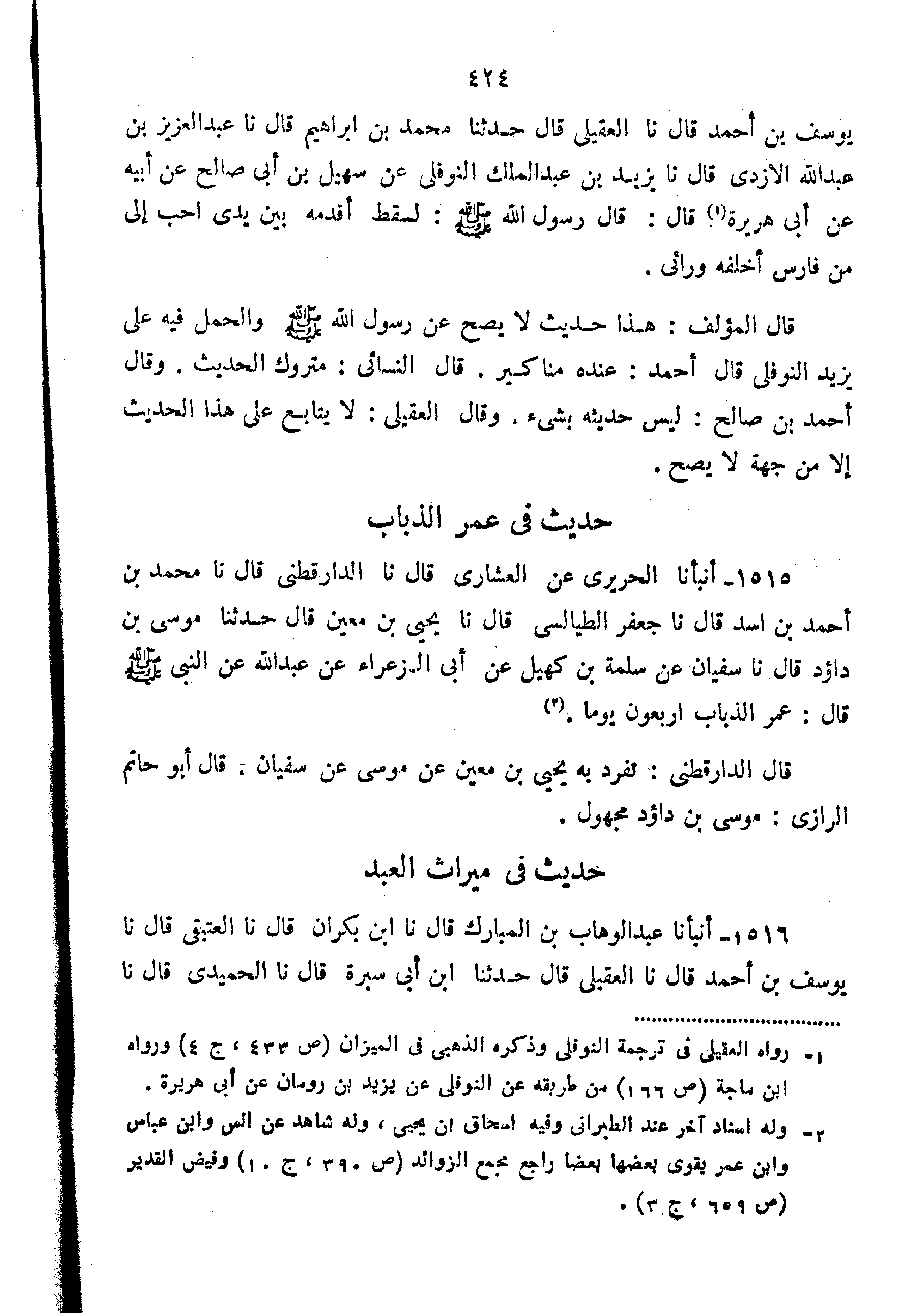 1516-أَنْبَأَنَا عَبْدُ الْوَهَّابِ بْنُ الْمُبَارَكِ قَالَ أَنَا ابْنُ بِكْرَانَ قَالَ نا الْعُتَيْقِيُّ قَالَ نا يُوسُفُ بْنُ أَحْمَدَ قَالَ نا الْعَقِيلِيُّ قَالَ حَدَّثَنَا ابْنُ أَبِي سَبْرَةَ قَالَ نا الْحُمَيْدِيُّ قَالَ نا