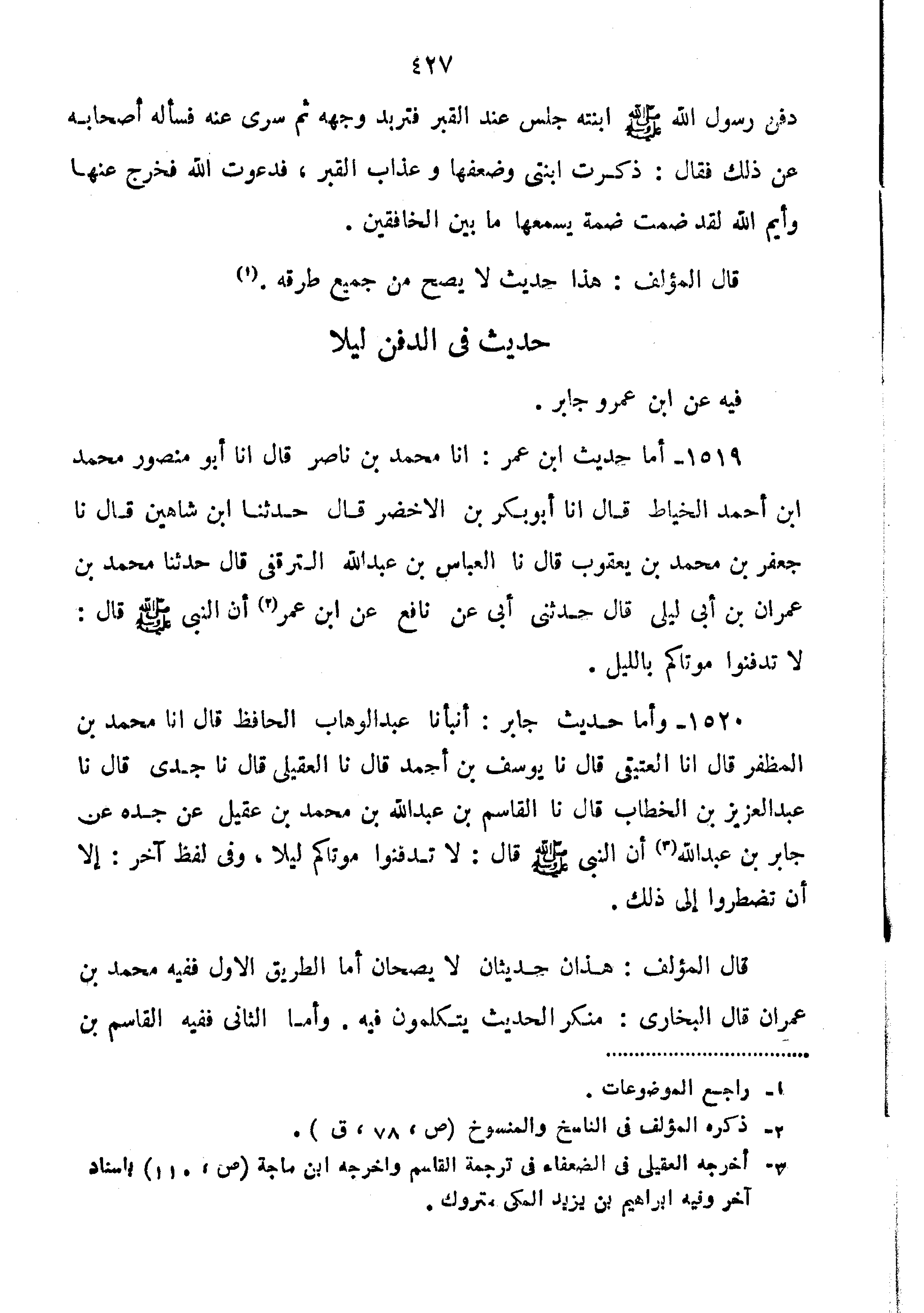 1519-أما حديث ابن عُمَر أَنَا مُحَمَّدُ بْنُ نَاصِرٍ قَالَ أَنَا أبو منصور محمد ابن أَحْمَدَ الْخَيَّاطُ قَالَ أَنَا أَبُو بَكْرِ بْنُ الأَخْضَرِ قَالَ حَدَّثَنَا ابْنُ شَاهِينَ قَالَ نا جَعْفَرُ بْنُ مُحَمَّدِ بْنِ يَعْقُوبَ قَالَ نا الْعَبَّاسُ بْنُ عَبْدِ اللَّهِ التَّرْقُفِيُّ قَالَ حَدَّثَنَا مُحَمَّدُ بْنُ عِمْرَانَ بْنِ أَبِي لَيْلَى قَالَ حَدَّثَنِي أَبِي عَنْ نَافِعٍ عَنِ ابْنِ عُمَرَ أَنّ النَّبِيَّ صَلَّى اللَّهُ عَلَيْهِ وَسَلَّمَ قَالَ "لا تَدْفِنُوا مَوْتَاكُمْ بِاللَّيْلِ"