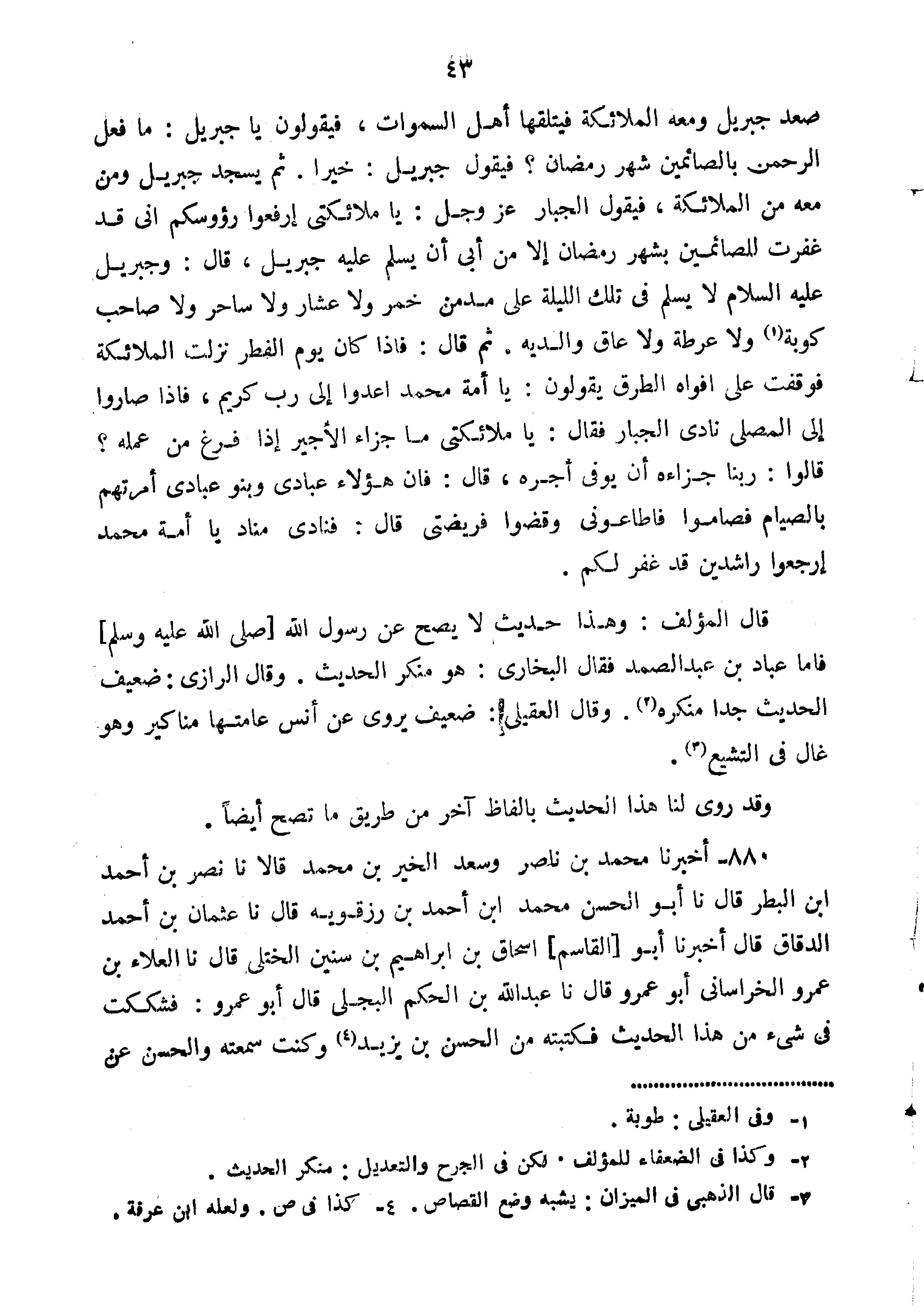 قال المؤلف: "وهذا حَدِيثٌ لا يَصِحُّ عَنْ رَسُولِ اللَّهِ صَلَّى اللَّهُ عَلَيْهِ وَسَلَّمَ فأما عباد بْن عَبْد الصمد فقال الْبُخَارِيّ هُوَ منكر الحديث وقال الرازي ضعيف الحديث جدًا منكره وقال العقيلي: "ضعيف يروي عن أنس عامتها مناكير وهو غال فِي التشيع".