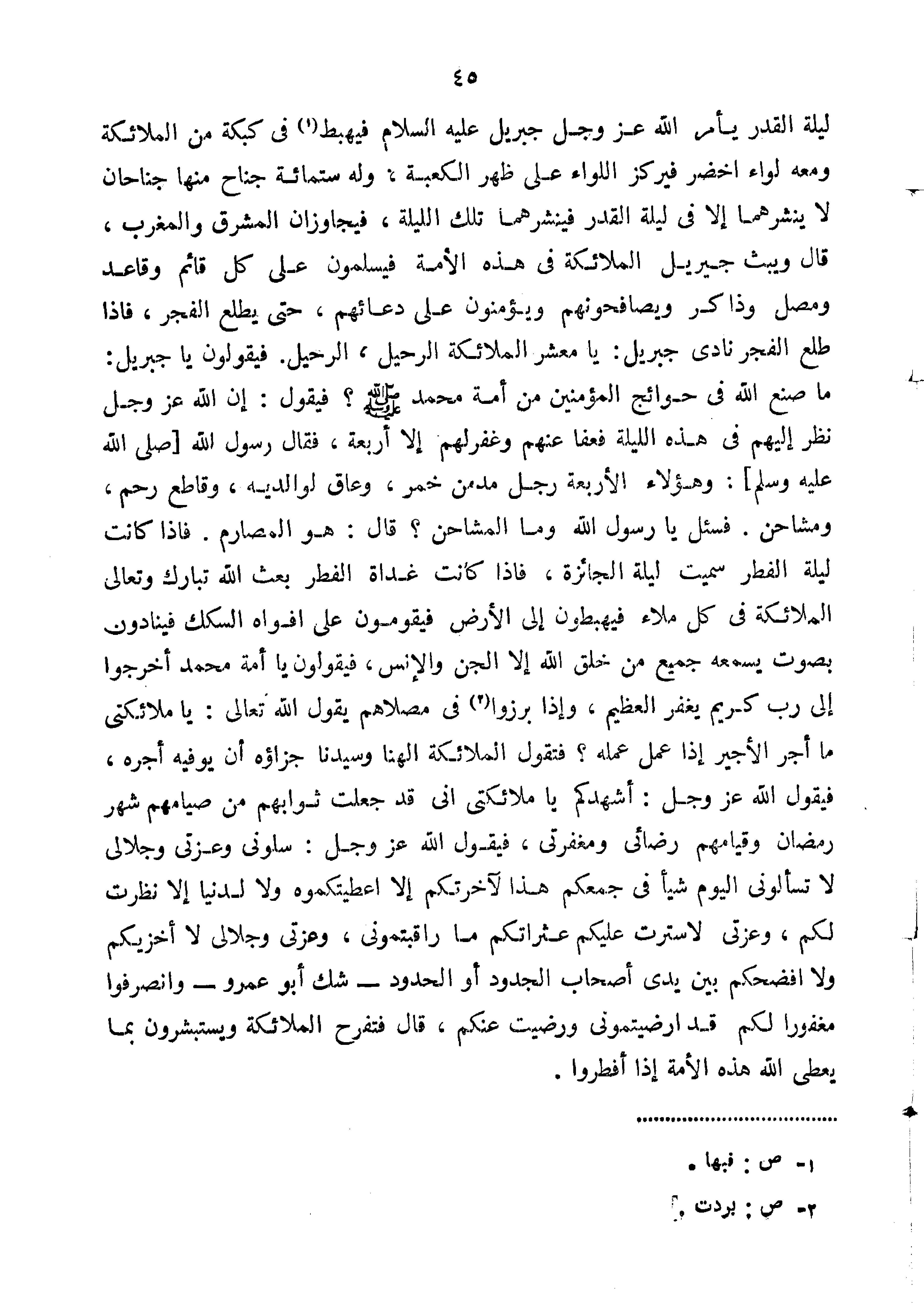 لَيْلَةُ الْقَدْرِ يَأْمُرُ اللَّهُ عَزَّ وَجَلَّ جِبْرِيلَ عَلَيْهِ السَّلامُ فَيَهْبِطُ في كبكة من الملائكة ومعه لِوَاءٌ أَخْضَرُ فَيُرْكِزُ اللِّوَاءَ عَلَى ظَهْرِ الْكَعْبَةِ وَلَهُ سِتُّمِائَةِ جَنَاحٍ مِنْهَا جَنَاحَانِ لا يَنْشُرُهُمَا إِلا فِي لَيْلَةِ الْقَدْرِ فَيَنْشُرُهُمَا تِلْكَ اللَّيْلَةَ فَيُجَاوِزَانِ الْمَشْرِقَ وَالْمَغْرِبَ قَالَ وَيَبُثُّ جِبْرِيلُ الْمَلائِكَةَ فِي هَذِهِ الأُمَّةِ فَيُسَلِّمُونَ عَلَى كُلِّ قَائِمٍ وَقَاعِدٍ وَمُصَلٍّ وَذَاكِرٍ وَيُصَافِحُونَهُمْ وَيُؤَمِّنُونَ عَلَى دُعَائِهِمْ حَتَّى يَطْلُعَ الْفَجْرُ فَإِذَا طَلَعَ الْفَجْرُ نَادَى جِبْرِيلُ يَا مَعْشَرَ الْمَلائِكَةِ الرَّحِيلَ الرَّحِيلَ فَيَقُولُونَ يَا جِبْرِيلُ مَا صَنَعَ اللَّهُ فِي حَوَائِجِ الْمُؤْمِنِينَ مِنْ أُمَّةِ مُحَمَّدٍ صَلَّى اللَّهُ عَلَيْهِ وَسَلَّمَ فَيَقُولُ إِنَّ اللَّهَ عَزَّ وَجَلَّ نَظَرَ إِلَيْهِمْ فِي هَذِهِ اللَّيْلَةِ فَعَفَا عَنْهُمْ وَغَفَرَ لَهُمْ إِلا أَرْبَعَةً فَقَالَ رَسُولُ اللَّهِ صَلَّى اللَّهُ عَلَيْهِ وَسَلَّمَ: "وَهَؤُلاءِ الأَرْبَعَةُ رَجُلٌ مُدْمِنُ خَمْرٍ وَعَاقٌّ لِوَالِدَيْهِ وَقَاطِعُ رَحِمٍ وَمُشَاحِنٌ فَسُئِلَ يَا رَسُولَ اللَّهِ وَمَا الْمُشَاحِنُ قَالَ هُوَ الْمُصَارِمُ فَإِذَا كَانَتْ لَيْلَةُ الْفِطْرِ سُمِّيَتْ لَيْلَةَ الْجَائِزَةِ فَإِذَا كَانَتْ غَدَاةُ الْفِطْرِ بَعَثَ اللَّهُ تَبَارَكَ وَتَعَالَى الْمَلائِكَةَ فِي كُلِّ مَلإٍ فَيَهْبِطُونَ إِلَى الأَرْضِ فَيَقُومُونَ عَلَى أَفْوَاهِ السِّكَكِ فَيُنَادُونَ بِصَوْتٍ يَسْمَعُهُ جَمِيعُ مَنْ خَلَقَ اللَّهُ إِلا الْجِنَّ وَالإِنْسَ فَيَقُولُونَ يَا أُمَّةَ مُحَمَّدٍ اخْرُجُوا إِلَى رَبٍّ كَرِيمٍ يَغْفِرِ الْعَظِيمَ وَإِذَا بَرَزُوا فِي مُصَلاهُمْ يَقُولُ اللَّهُ تَعَالَى يَا مَلائِكَتِي مَا أَجْرُ الأَجِيرِ إِذَا عَمِلَ عَمَلَهُ فَتَقُولُ الْمَلائِكَةُ إِلَهَنَا وَسَيِّدُنَا جَزَاؤُهُ أَنْ يُوَفِّيَهُ أَجْرَهُ فَيَقُولُ اللَّهُ عَزَّ وَجَلَّ أُشْهِدُكُمْ يَا مَلائِكَتِي أَنِّي قد جَعَلْتُ ثَوَابَهُمْ مِنْ صِيَامِهِمْ شَهْرَ رَمَضَانَ وَقِيَامِهِمْ رِضَائِي وَمَغْفِرَتِي فَيَقُولُ اللَّهُ عَزَّ وَجَلَّ سَلُونِي وَعِزَّتِي وَجَلالِي لا تَسْأَلُونِي الْيَوْمَ شَيْئًا فِي جَمْعِكُمْ هَذَا لآخِرَتِكُمْ إِلا أَعْطَيْتُكُمُوهُ وَلا لِدُنْيَا إِلا نَظَرْتُ لَكُمْ وَعِزَّتِي لا سَتَرْتُ عَلَيْكُمْ عَثَرَاتِكُمْ مَا رَاقَبْتُمُونِي وَعِزَّتِي وَجَلالِي لا أُخْزِيكُمْ وَلا أَفْضَحُكُمْ بَيْنَ يَدَيْ أَصْحَابِ الْجُدُودِ أَوِ الْحُدُودِ شَكَّ أَبُو عَمْرٍو وَانْصَرِفُوا مَغْفُورًا لَكُمْ قَدْ أَرْضَيْتُمُونِي وَرَضِيتُ عَنْكُمْ قَالَ فَتَفْرَحُ الْمَلائِكَةُ وَيَسْتَبْشِرُونَ بِمَا يُعْطِي اللَّهُ هَذِهِ الأُمَّةَ إِذَا أَفْطَرُوا".