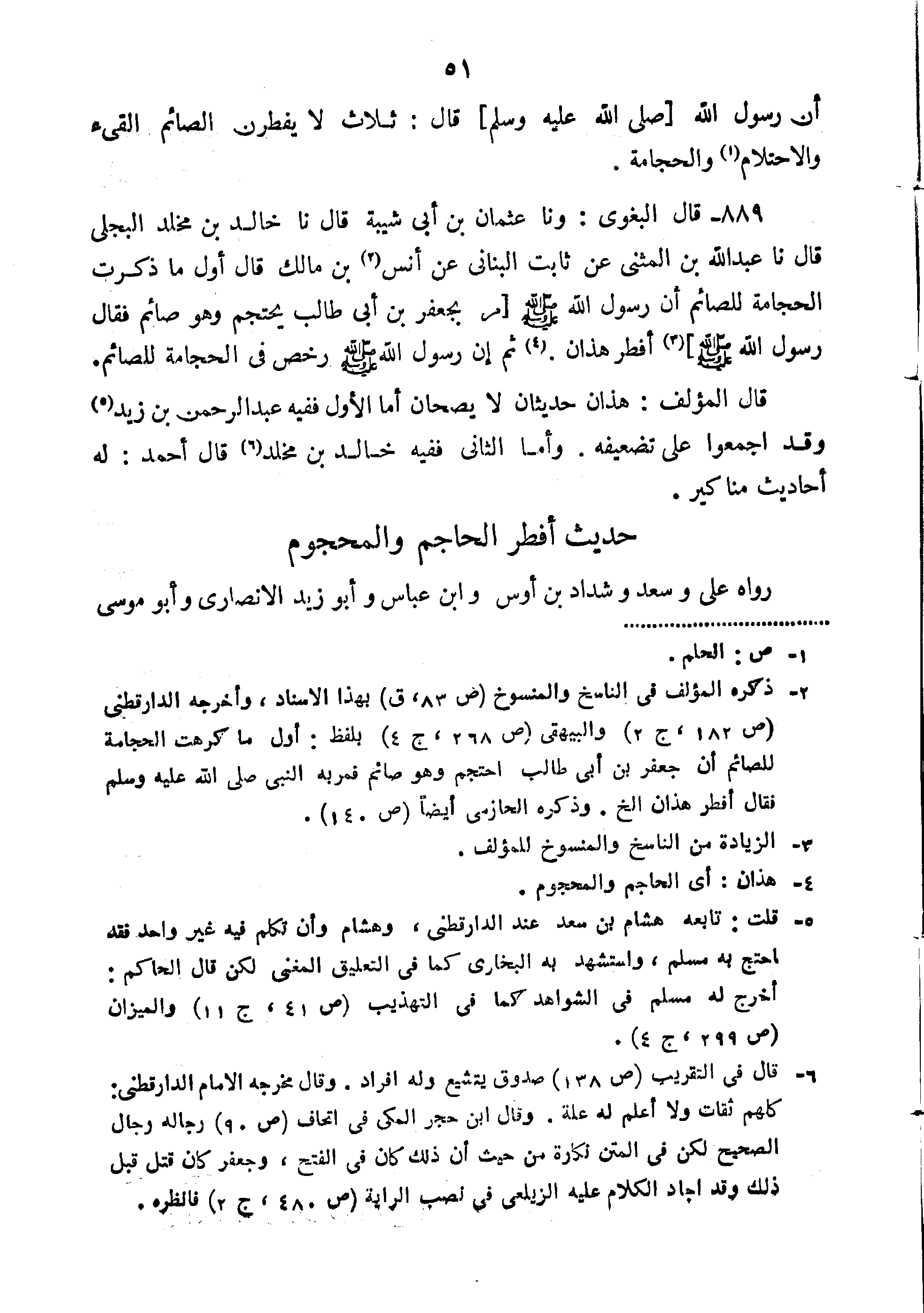 889-قَالَ الْبَغَوِيُّ وَنا عُثْمَانُ بْنُ أَبِي شَيْبَةَ قَالَ نا خَالِدُ بْنُ مَخْلَدٍ الْبَجَلِيُّ قَالَ نا عَبْدُ اللَّهِ بْنِ الْمُثَنَّى عَنْ ثَابِتٍ الْبُنَانِيِّ عَنْ أَنَسِ بْنِ مَالِكٍ قَالَ أَوَّلُ مَا ذُكِرَتِ الْحِجَامَةُ لِلصَّائِمِ أَنَّ رَسُولَ اللَّهِ صَلَّى اللَّهُ عَلَيْهِ وَسَلَّمَ مَرَّ بِجَعْفَرِ بْنِ أَبِي طَالِبٍ يَحْتَجِمُ وَهُوَ صَائِمٌ فَقَالَ رَسُولُ اللَّهِ صَلَّى اللَّهُ عَلَيْهِ وَسَلَّمَ: "أَفْطَرَ هَذَانِ ثُمَّ أَنَّ رَسُولَ اللَّهِ صَلَّى اللَّهُ عَلَيْهِ وَسَلَّمَ رَخَّصَ فِي الْحِجَامَةِ للصائم".