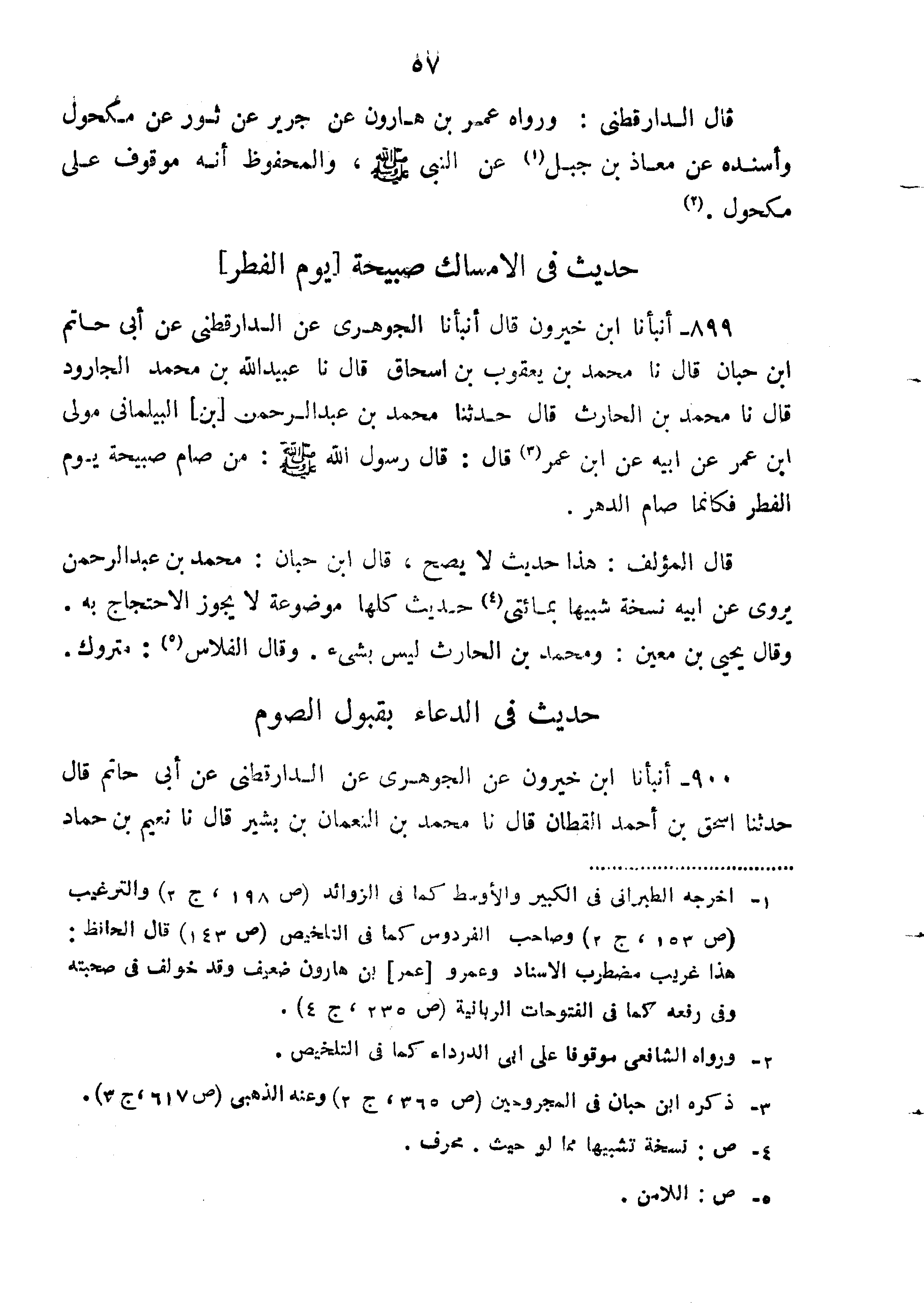 899-أَنْبَأَنَا ابْنُ خَيْرُونَ قَالَ أَنْبَأَنَا الْجَوْهَرِيُّ عَنِ الدَّارَقُطْنِيِّ عَنْ أَبِي حَاتِمِ ابن حَبَّانَ قَالَ نا مُحَمَّدُ بْنُ يَعْقُوبُ بْنُ إِسْحَاقَ قَالَ نا عُبَيْدُ اللَّهِ بْنُ مُحَمَّدٍ الْجَارُودُ قَالَ نا مُحَمَّدُ بْنُ الْحَارِثِ قَالَ حَدَّثَنَا مُحَمَّدُ بْنُ عَبْدِ الرَّحْمَنِ بْنِ الْبَيْلَمَانِيِّ مَوْلَى ابْنِ عُمَرَ عَنْ أَبِيهِ عَنِ ابْنِ عُمَرَ قَالَ: قَالَ رَسُولُ اللَّهِ صَلَّى اللَّهُ عَلَيْهِ وَسَلَّمَ: "مَنْ صَامَ صَبِيحَةَ يَوْمِ الْفِطْرِ فَكَأَنَّمَا صَامَ الدَّهْرَ".