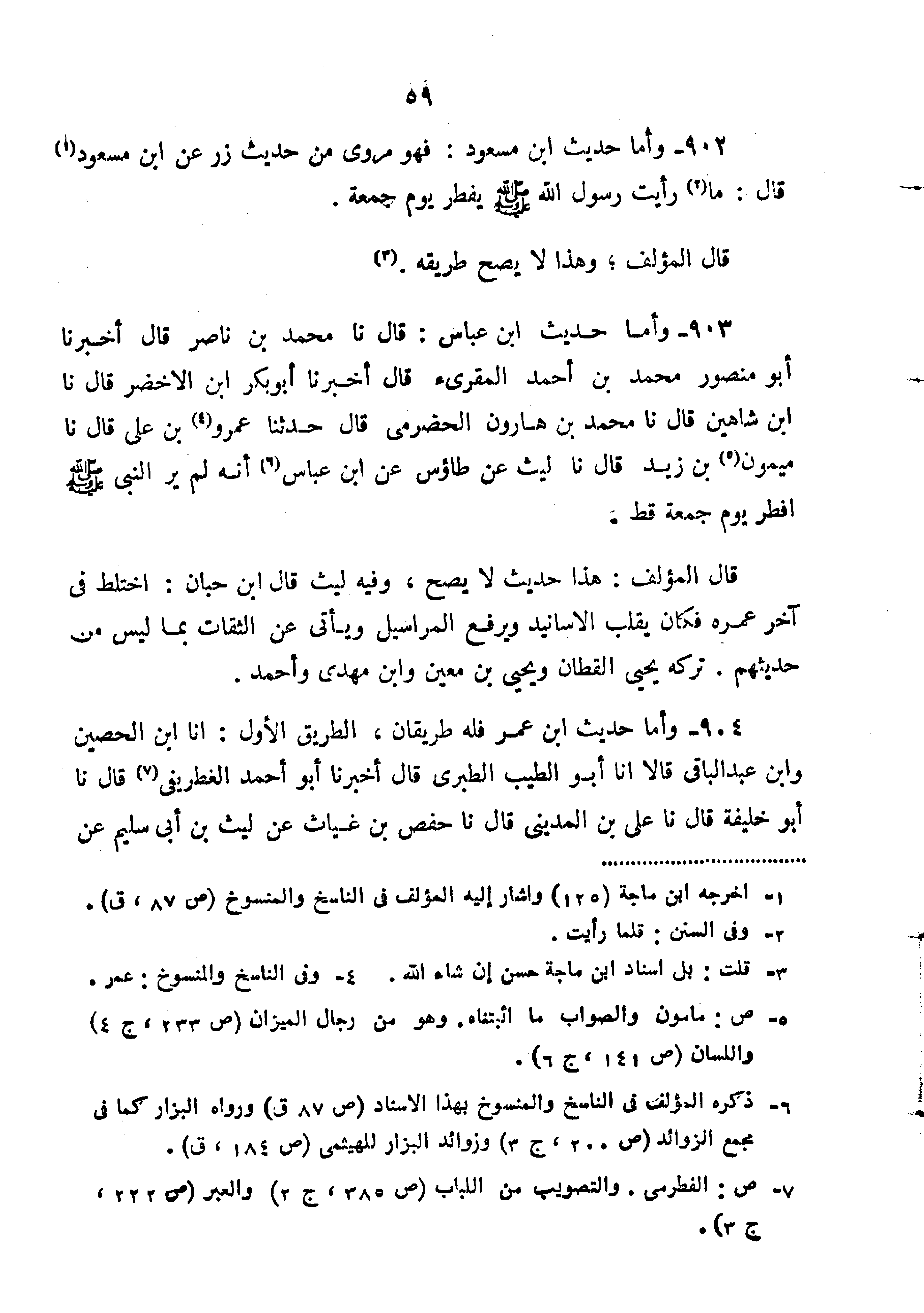 902-وَأَمَّا حَدِيثُ ابْنِ مَسْعُودٍ فَهُوَ مَرْوِيٌّ مِنْ حَدِيثِ زَرٍّ عَنِ ابْنِ مَسْعُودٍ قَالَ مَا رَأَيْتُ رَسُولِ اللَّهِ صَلَّى اللَّهُ عَلَيْهِ وَسَلَّمَ يُفْطِرُ يَوْمَ جُمُعَةٍ".