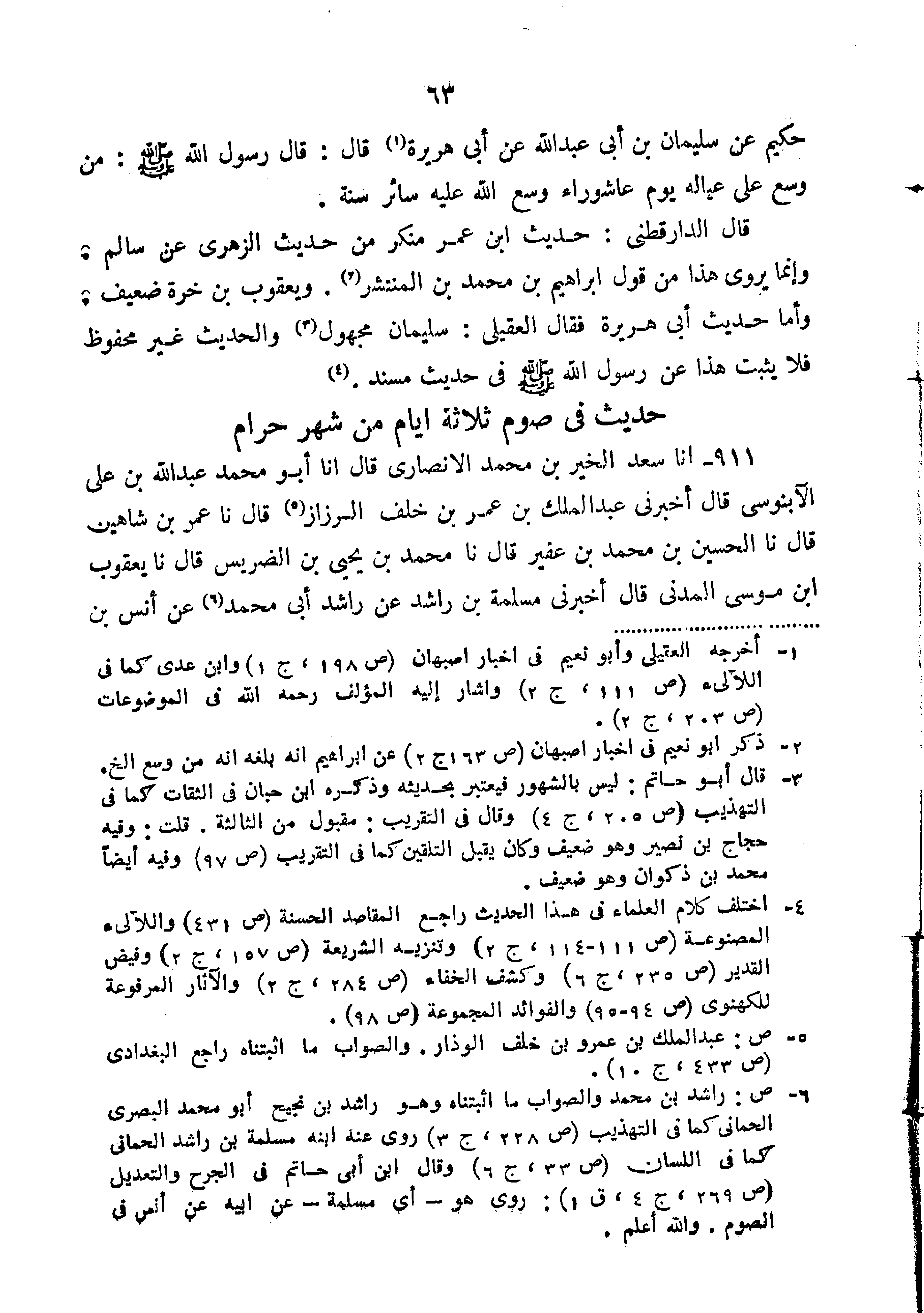 حَكِيمٍ عَنْ سُلَيْمَانَ بْنِ أَبِي عَبْدِ اللَّهِ عَنْ أَبِي هُرَيْرَةَ قَالَ: قَالَ رَسُولُ اللَّهِ صَلَّى اللَّهُ عَلَيْهِ وَسَلَّمَ: "مَنْ وَسَّعَ عَلَى عِيَالِهِ يَوْمَ عَاشُورَاءَ وَسَّعَ اللَّهُ عَلَيْهِ سَائِرَ سَنَةٍ".
