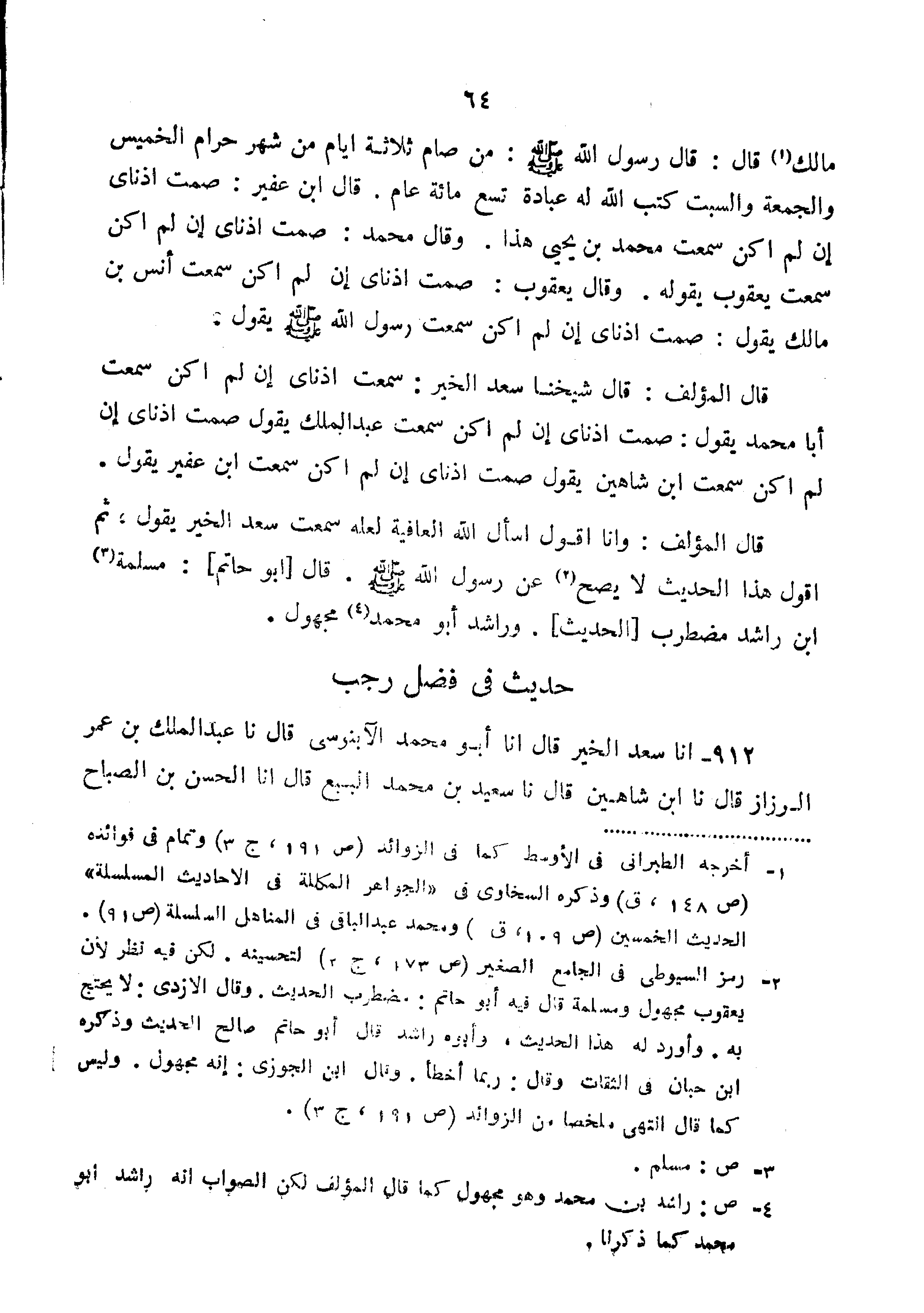 مَالِكٍ قَالَ: قَالَ رَسُولُ اللَّهِ صَلَّى اللَّهُ عَلَيْهِ وَسَلَّمَ: "مَنْ صَامَ ثَلاثَةَ أَيَّامٍ مِنْ شَهْرٍ حَرَامٍ الْخَمِيسَ وَالْجُمُعَةَ وَالسَّبْتَ كتب الله له عبادة تسع مائة عَامٍ قال ابن عفير صمت أذناي إن لم أكن سمعت مُحَمَّد بْن يَحْيَى هَذَا وقال مُحَمَّد صمت أذناي إن لم أكن سمعت يعقوب يقوله وقال يعقوب صمت أذناي إن لم أكن سمعت يروي بْن مالك يقول صمت أذناي إن لم أكن سمعت رسول اللَّهِ صَلَّى اللَّهُ عَلَيْهِ وَسَلَّمَ يقول".
