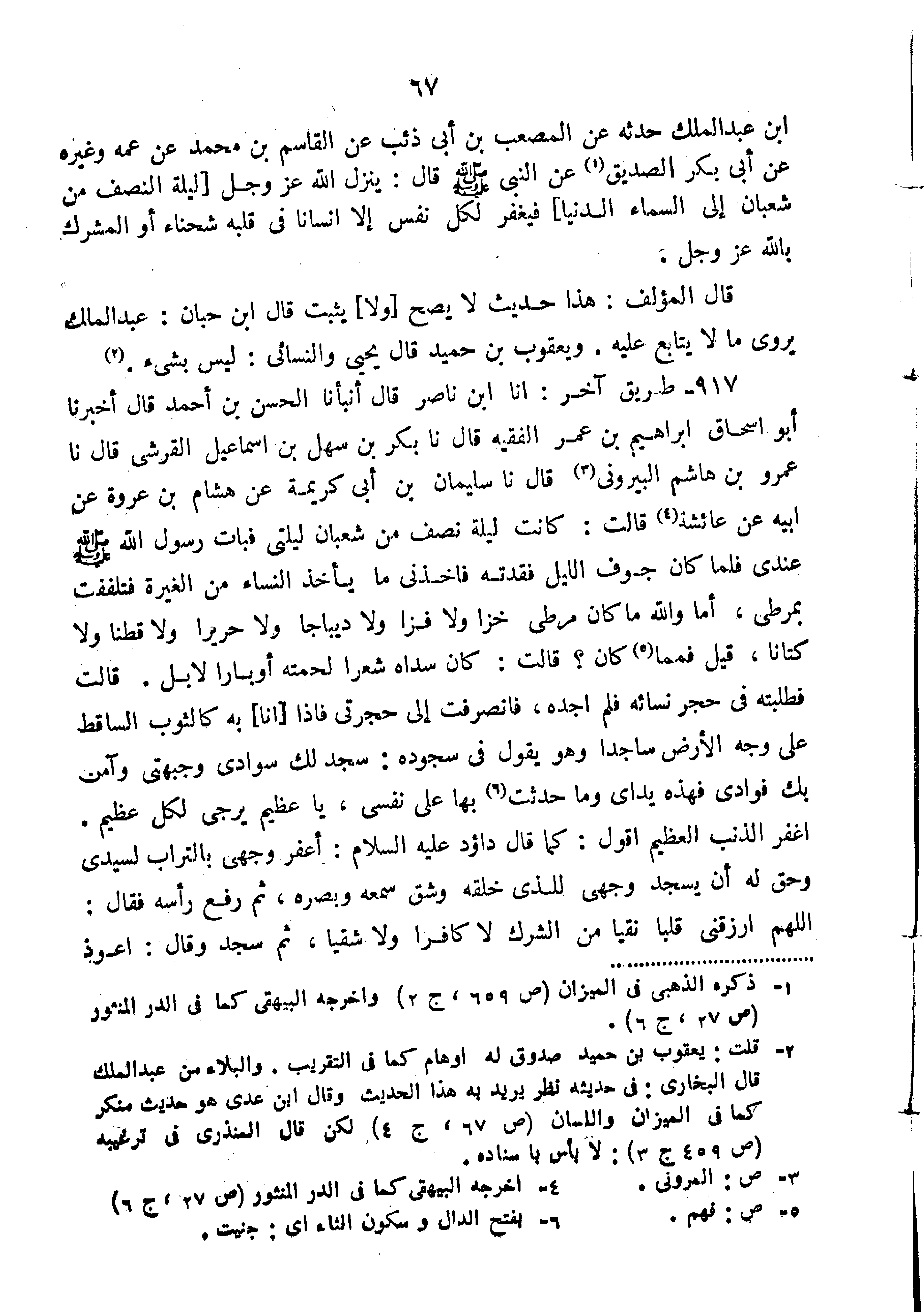 917-طَرِيقٌ آخَرُ أَنَا ابْنُ نَاصِرٍ قَالَ أَنْبَأَنَا الْحَسَنُ بْنُ أَحْمَدَ قَالَ أَخْبَرَنَا أَبُو إِسْحَاقَ إِبْرَاهِيمُ بْنُ عُمَرَ الْفَقِيهُ قَالَ نا بَكْرُ بْنُ سَهْلِ بْنِ إِسْمَاعِيلَ الْقُرَشِيُّ قَالَ نا عَمْرُو بْنُ هَاشِمٍ الْبَيْرُونِيُّ قَالَ نا سُلَيْمَانُ بْنُ أَبِي كَرِيمَةَ عَنْ هِشَامِ بْنِ عُرْوَةَ عَنْ أَبِيهِ عَنْ عَائِشَةَ قَالَتْ كَانَتْ لَيْلَةُ نِصْفٍ مِنْ شَعْبَانَ لَيْلَتِي فَبَاتَ رَسُولُ اللَّهِ صَلَّى اللَّهُ عَلَيْهِ وَسَلَّمَ عِنْدِي فَلَمَّا كَانَ جَوْفُ اللَّيْلِ فَقَدْتُهُ فَأَخَذَنِي مَا يَأْخُذُ النِّسَاءَ مِنَ الْغَيْرَةِ فَتَلَفَّفْتُ بِمِرْطِي أَمَا وَاللَّهِ مَا كَانَ مِرْطِي خَزًّا وَلا فَزًّا وَلا دِيبَاجًا وَلا حَرِيرًا وَلا قُطْنًا وَلا كِتَّانًا قِيلَ فَمِمَّا كَانَ قَالَتْ كَانَ سَدَاهُ شَعْرًا لَحَمْتُهُ أَوْبَارًا لإِبِلٍ قَالَتْ فَطَلَبْتُهُ فِي حِجْرِ نِسَائِهِ فَلَمْ أَجِدْهُ فَانْصَرَفْتُ إِلَى حُجْرَتِي فَإِذَا أَنَا بِهِ كَالثَّوْبِ السَّاقِطِ عَلَى وَجْهِ الأَرْضِ سَاجِدًا وَهُوَ يَقُولُ فِي سُجُودِهِ سَجَدَ لَكَ سَوَادِي وَجَبْهَتِي وَآمَنَ بِكَ فُؤَادِي فَهَذِهِ يَدَايَ وَمَا حَدَّثَتْ بِهَا عَلَى نَفْسِي يَا عَظِيمُ يُرْجَى لِكُلِّ عَظِيمٍ اغْفِرِ الذَّنْبَ الْعَظِيمَ أَقُولُ كَمَا قَالَ دَاؤُدُ عَلَيْهِ السَّلامُ أُعَفِّرُ وَجْهِي بِالتُّرَابِ لِسَيِّدِي وَحُقَّ لَهُ أَنْ يَسْجُدَ وَجْهِي لِلَّذِي خَلْقَهُ وَشَقَّ سَمْعَهُ وَبَصَرَهُ ثُمَّ رَفَعَ رَأْسَهُ فَقَالَ اللَّهُمَّ ارْزُقْنِي قَلْبًا نَقِيًّا مِنَ الشِّرْكِ لا كَافِرًا وَلا شَقِيًّا ثُمَّ سَجَدَ قَالَ أَعُوذُ