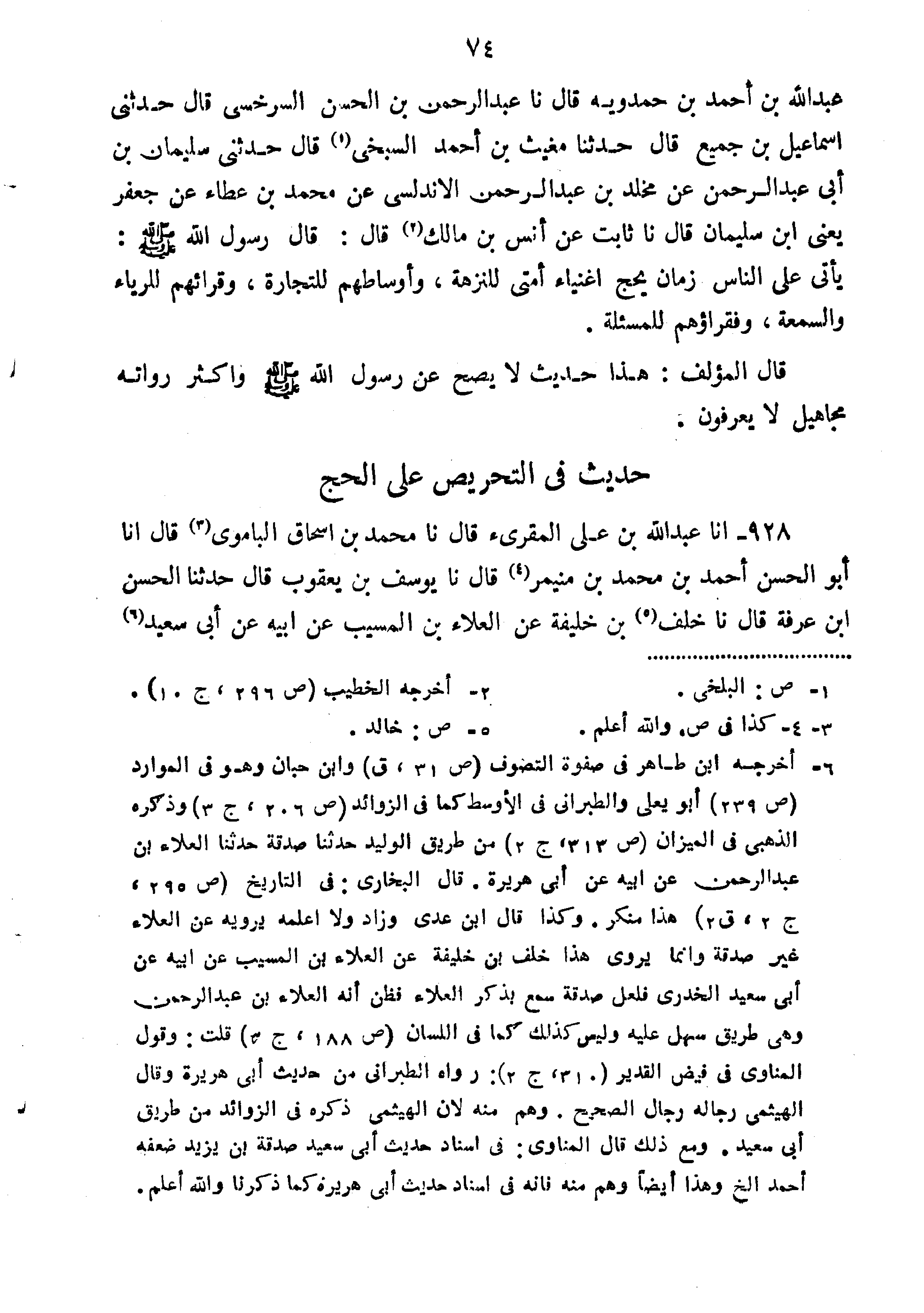 عَبْدُ اللَّهِ بْنُ أَحْمَدَ بْنِ حموديه قَالَ نا عَبْدُ الرَّحْمَنِ بْنُ الحسن السر خسي قَالَ حَدَّثَنِي إِسْمَاعِيلُ بْنُ جُمَيْعٍ قَالَ حَدَّثَنَا مُغِيثُ بْنُ أَحْمَدَ السبخي قال حدثني سليمان ابن أَبِي عَبْدِ الرَّحْمَنِ عَنْ مَخْلَدِ بْنِ عَبْدِ الرَّحْمَنِ الأَنْدَلُسِيِّ عَنْ مُحَمَّدِ بْنِ عَطَاءٍ عَنْ جَعْفَرٍ يَعْنِي ابْنَ سُلَيْمَانَ قَالَ نا ثَابِتٍ عَنْ أَنَسِ بْنِ مَالِكٍ قَالَ: قَالَ رَسُولُ اللَّهِ صَلَّى اللَّهُ عَلَيْهِ وَسَلَّمَ: "يَأْتِي عَلَى النَّاسِ زَمَانٌ يَحُجُّ أَغْنِيَاءُ أُمَّتِي لِلنُّزْهَةِ وَأَوْسَاطُهُمْ لِلتِّجَارَةِ وَقُرَّاؤُهُمْ لِلرِّيَاءِ وَالسُّمْعَةِ وَفُقَرَاؤُهُمْ لِلْمَسْأَلَةِ".