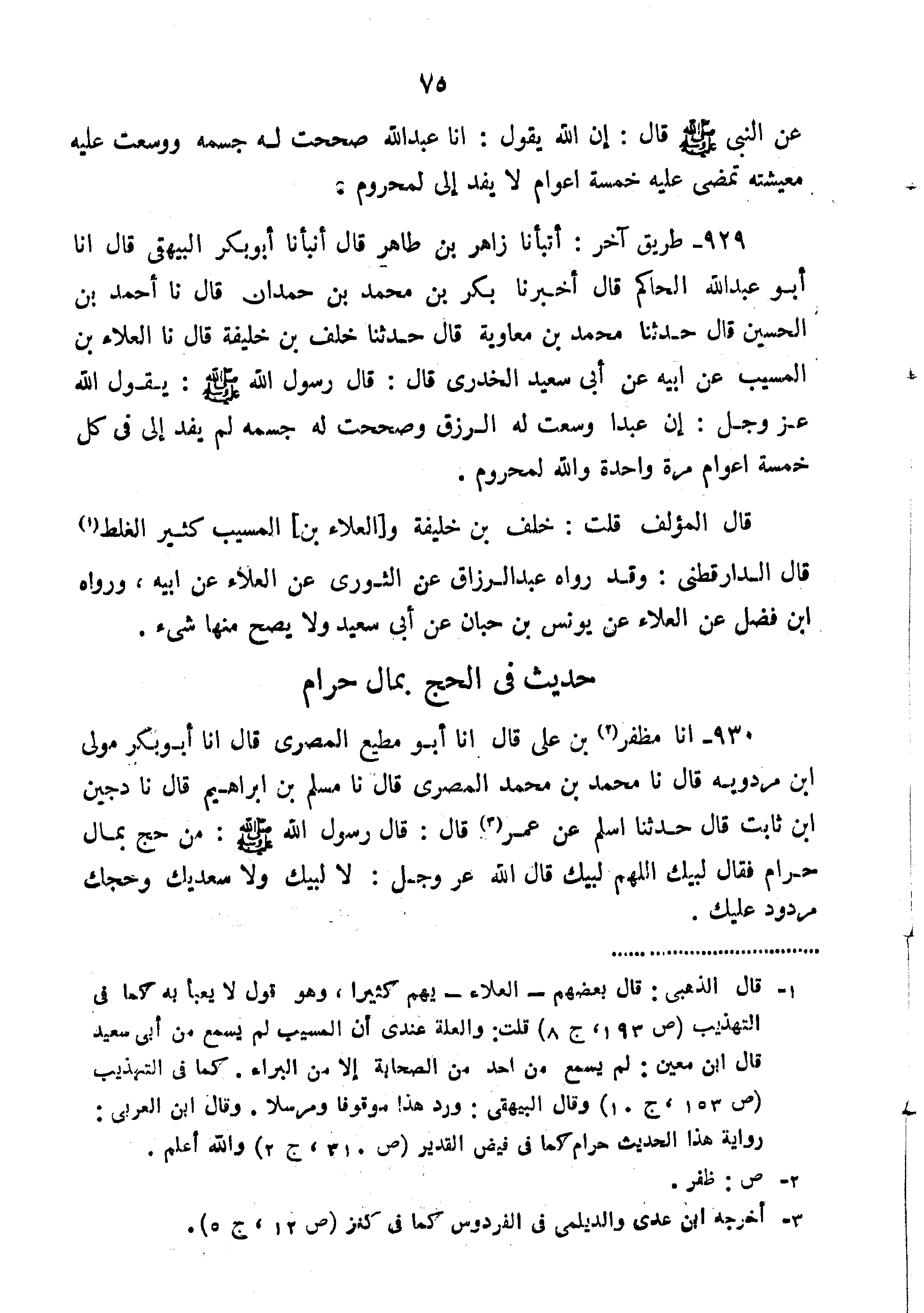 929-طَرِيقٌ آخَرُ أَنْبَأَنَا زَاهِرُ بْنُ طَاهِرٍ قَالَ أَنْبَأَنَا أَبُو بكر البيهقي قال أنا أبوعبد اللَّهِ الْحَاكِمُ قَالَ أَخْبَرَنَا بَكْرُ بْنُ مُحَمَّدِ بْنِ حَمْدَانَ قَالَ نا أَحْمَدُ بْنُ الْحُسَيْنِ قَالَ حَدَّثَنَا مُحَمَّدُ بْنُ مُعَاوِيَةَ قَالَ حَدَّثَنَا خَلَفُ بْنُ خَلِيفَةَ قَالَ نا الْعَلاءُ بْنُ الْمُسَيِّبِ عَنْ أَبِيهِ عَنْ أَبِي سَعِيدٍ الْخُدْرِيِّ قَالَ: قَالَ رَسُولُ اللَّهِ صَلَّى اللَّهُ عَلَيْهِ وَسَلَّمَ: "يَقُولُ اللَّهُ عَزَّ وَجَلَّ إِنَّ عَبْدًا وَسَّعْتُ لَهُ الرِّزْقَ وَصَحَّحْتُ لَهُ جِسْمَهُ لَمْ يَفِدْ إِلَيَّ فِي كُلِّ خَمْسَةِ أَعْوَامٍ مَرَّةً وَاحِدَةً وَاللَّهِ لَمَحْرُومٌ".