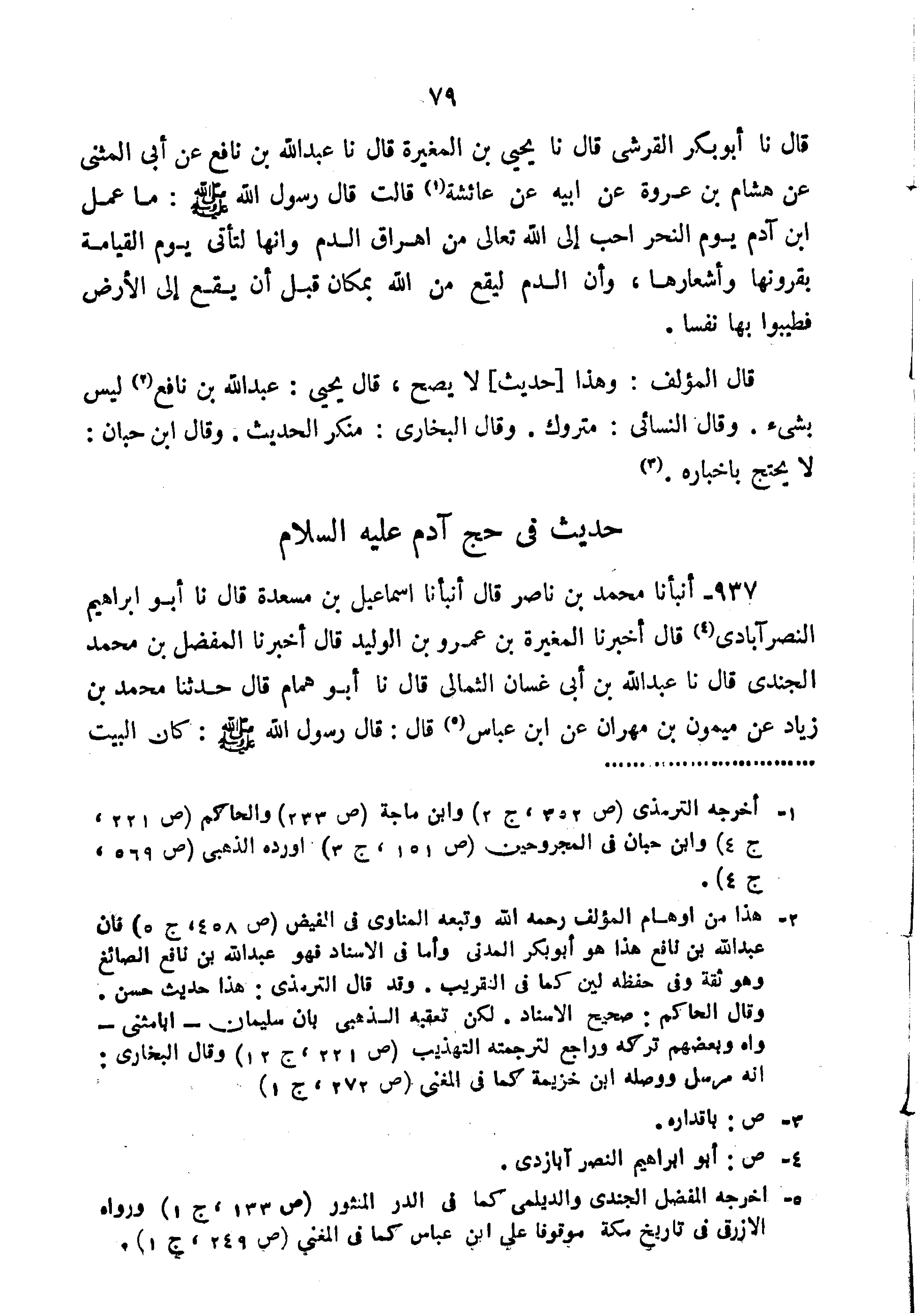 قال نا أبوبكر الْقُرَشِيُّ قَالَ نا يَحْيَى بْنُ الْمُغِيرَةِ قَالَ نا عَبْدُ اللَّهِ بْنُ نَافِعٍ عَنْ أَبِي الْمُثَنَّى عَنْ هِشَامِ بْنِ عُرْوَةَ عَنْ أَبِيهِ عَنْ عَائِشَةَ قَالَتْ قَالَ رَسُولِ اللَّهِ صَلَّى اللَّهُ عَلَيْهِ وَسَلَّمَ: "مَا عَمِلَ ابْنُ آدَمَ يَوْمَ النَّحْرِ أَحَبُّ إِلَى اللَّهِ تَعَالَى مِنْ إِهْرَاقِ الدَّمِ وَإِنَّهَا لَتَأْتِي يَوْمَ الْقِيَامَةِ بِقُرُونِهَا وَأَشْعَارِهَا وَإِنَّ الدَّمَ لَيَقَعُ مِنَ اللَّهِ بِمَكَانٍ قَبْلَ أَنْ يَقَعَ إِلَى الأَرْضِ فَطِيبُوا بِهَا نَفْسًا".