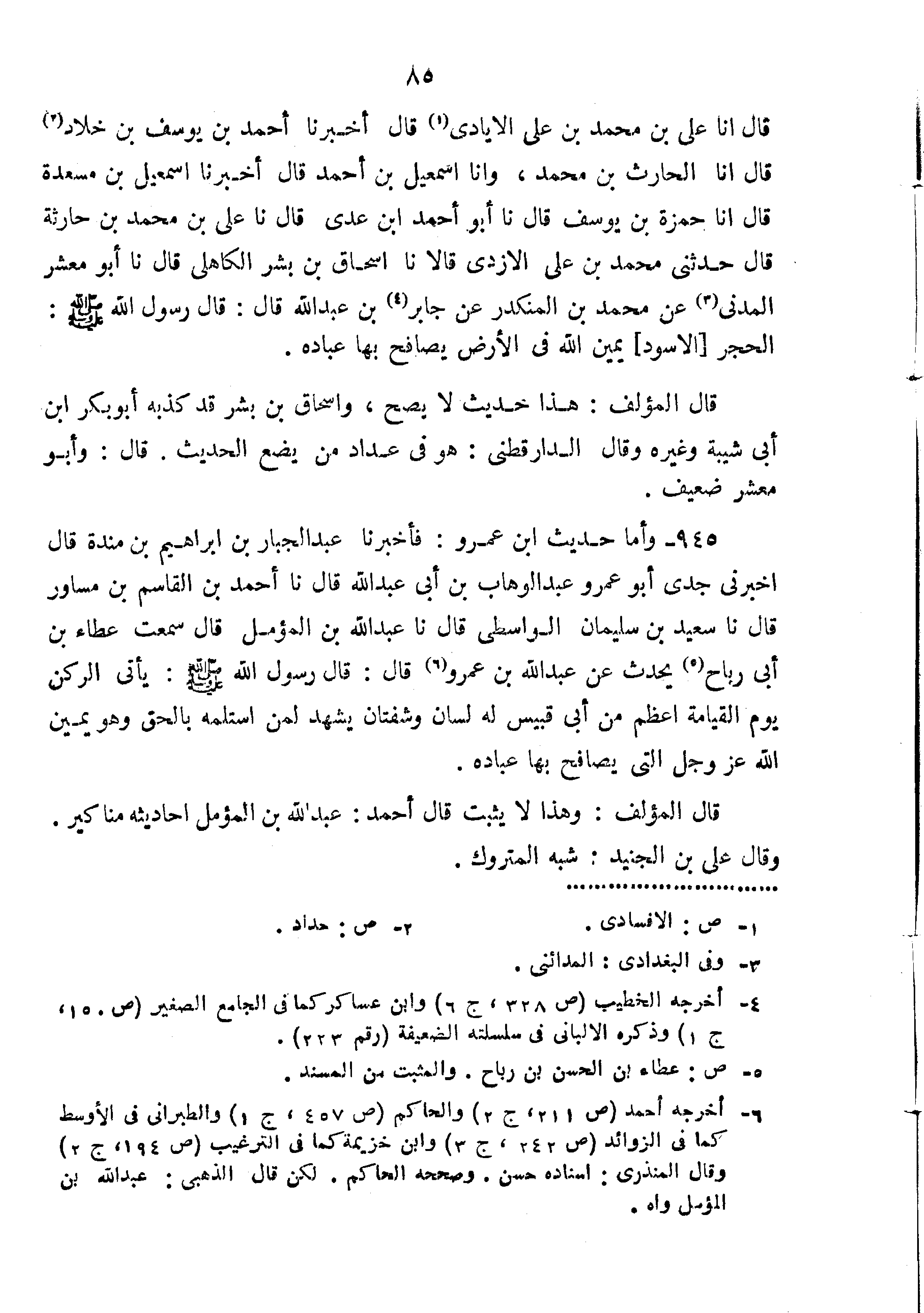 قَالَ أَنَا عَلِيُّ بْنُ مُحَمَّدٍ بْنِ عَلِيٍّ الأَيَادِيُّ قَالَ أَخْبَرَنَا أَحْمَدُ بْنُ يُوسُفَ بْنِ خَلادٍ قَالَ أَنَا الْحَارِثُ بْنُ مُحَمَّدٍ وَأنا إِسْمَاعِيلُ بْنُ أَحْمَدَ قَالَ أَخْبَرَنَا إِسْمَاعِيلُ بْنُ مَسْعَدَةَ قَالَ أَنَا حَمْزَةُ بْنُ يُوسُفَ قَالَ نا أَبُو أَحْمَدَ بْنُ عَدِيٍّ قَالَ نا عَلِيُّ بْنُ مُحَمَّدِ بْنِ حَارِثَةَ قَالَ حَدَّثَنِي مُحَمَّدُ بْنُ عَلِيٍّ الْأَزْدِيُّ قَالا نا إِسْحَاقُ بْنُ بِشْرٍ الْكَاهِلِيُّ قَالَ نا أَبُو مَعْشَرٍ الْمَدَنِيُّ عَنْ مُحَمَّدُ بْنُ الْمُنْكَدِرِ عَنْ جَابِرٍ بْنِ عَبْدِ اللَّهِ قَالَ: قَالَ رَسُولِ اللَّهِ صَلَّى اللَّهُ عَلَيْهِ وَسَلَّمَ: "الْحَجَرُ الأَسْوَدُ يَمِينُ اللَّهِ فِي الأَرْضِ يُصَافِحُ بِهَا عِبَادَهُ".