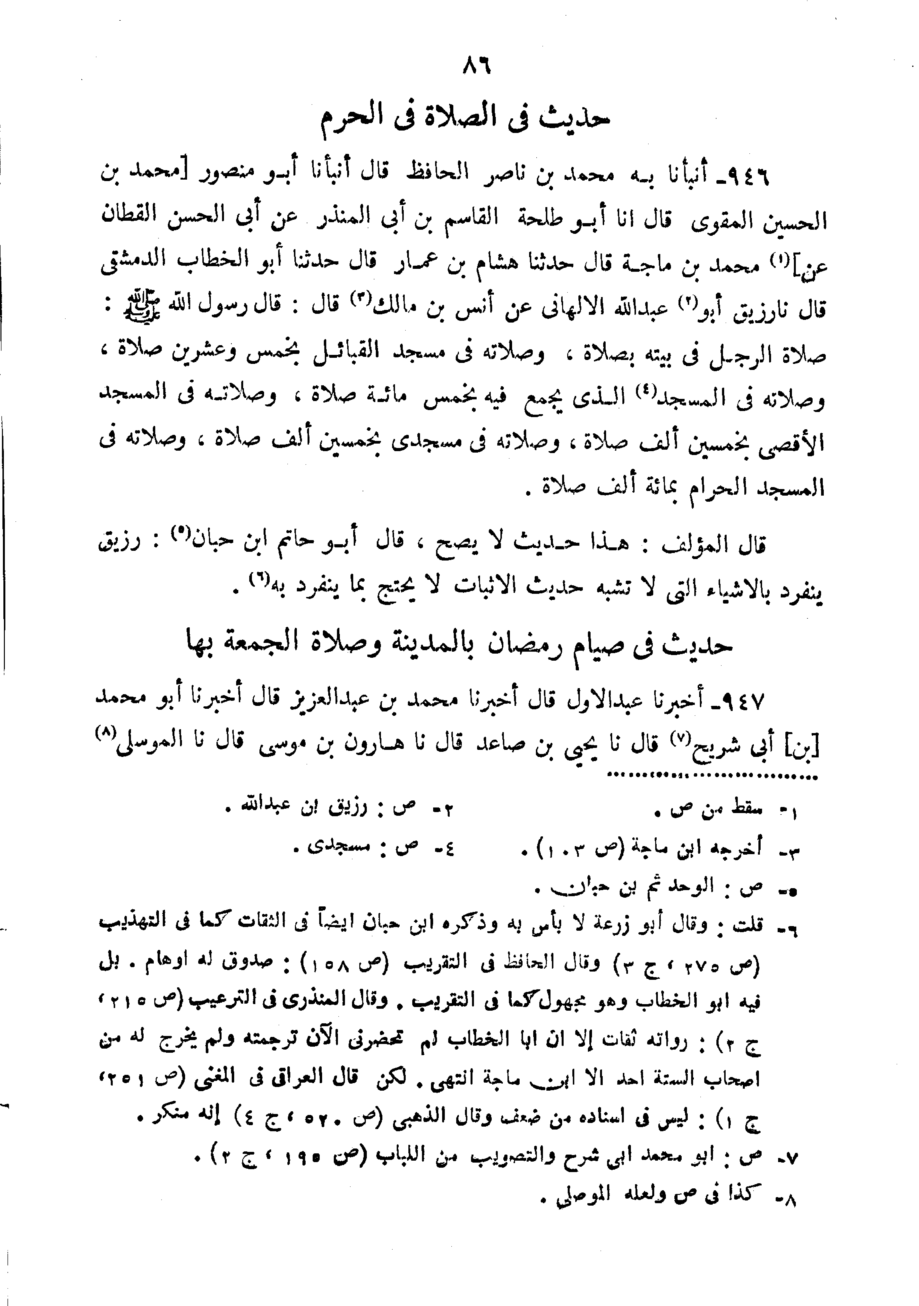 946-أَنْبَأَنَا بِهِ مُحَمَّدُ بْنُ نَاصِرٍ الْحَافِظُ قَالَ أَنْبَأَنَا أَبُو مَنْصُورٍ مُحَمَّدُ بْنُ الْحُسَيْنِ الْمُقْوِي قَالَ أَنَا أَبُو طَلْحَةَ الْقَاسِمُ بْنُ أَبِي الْمُنْذِرِ عَنْ أَبِي الْحَسَنِ الْقَطَّانِ عَنْ مُحَمَّدِ بْنِ مَاجَهْ قَالَ حَدَّثَنَا هِشَامُ بْنُ عَمَّارٍ قَالَ حَدَّثَنَا أَبُو الْخَطَّابِ الدِّمَشْقِيُّ قَالَ نا رُزَيْقُ أَبُو عَبْدِ اللَّهِ الأَلْهَانِيُّ عَنْ أَنَسِ بْنِ مَالِكٍ قَالَ: قَالَ رَسُولُ اللَّهِ صَلَّى اللَّهُ عَلَيْهِ وَسَلَّمَ: "صَلاةَ الرَّجُلِ فِي بَيْتِهِ بِصَلاةٍ وَصَلاتُهُ فِي مَسْجِدِ الْقَبَائِلِ بِخَمْسٍ وَعِشْرِينَ صَلاةً وَصَلاتُهُ فِي الْمَسْجِدِ الَّذِي يجمع فيه بخمس مائة صَلاةٍ وَصَلاتُهُ فِي الْمَسْجِدِ الأَقْصَى بِخَمْسِينَ أَلْفَ صَلاةٍ وَصَلاتُهُ فِي مَسْجِدِي بِخَمْسِينَ أَلْفَ صَلاةٍ وَصَلاتُهُ فِي الْمَسْجِدِ الْحَرَامِ بِمِائَةِ أَلْفِ صَلاةٌ".