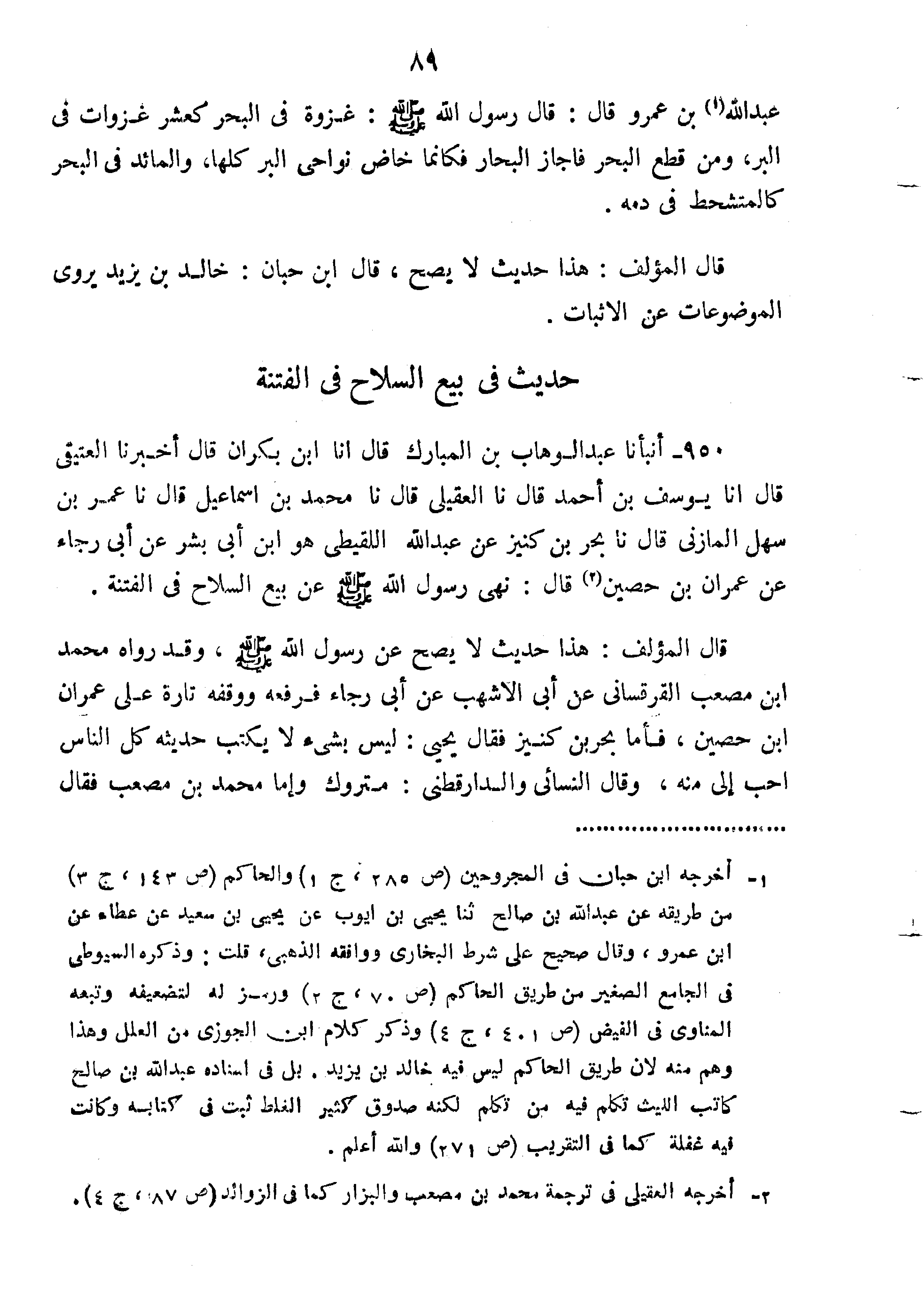 950-أَنْبَأَنَا عَبْدُ الْوَهَّابِ بْنُ الْمُبَارَكِ قَالَ أَنَا ابْنُ بَكْرَانَ قَالَ أَخْبَرَنَا الْعُتَيْقِيُّ قَالَ أَنَا يُوسُفُ بْنُ أَحْمَدَ قَالَ نا الْعَقِيلِيُّ قَالَ نا مُحَمَّدُ بْنُ إِسْمَاعِيلَ قَالَ نا عمر ابن سَهْلٍ الْمَازِنِيُّ قَالَ نا بَحْرُ بْنُ كَنِيزٍ عَنْ عَبْدِ اللَّهِ اللقيطي هو ابن أبي عشر عَنْ أَبِي رَجَاءَ عَنْ عِمْرَانَ بْنِ حُصَيْنٍ قَالَ نَهَى رَسُولُ اللَّهِ صَلَّى اللَّهُ عَلَيْهِ وَسَلَّمَ عَنْ بَيْعِ السِّلاحِ فِي الْفِتْنَةِ".