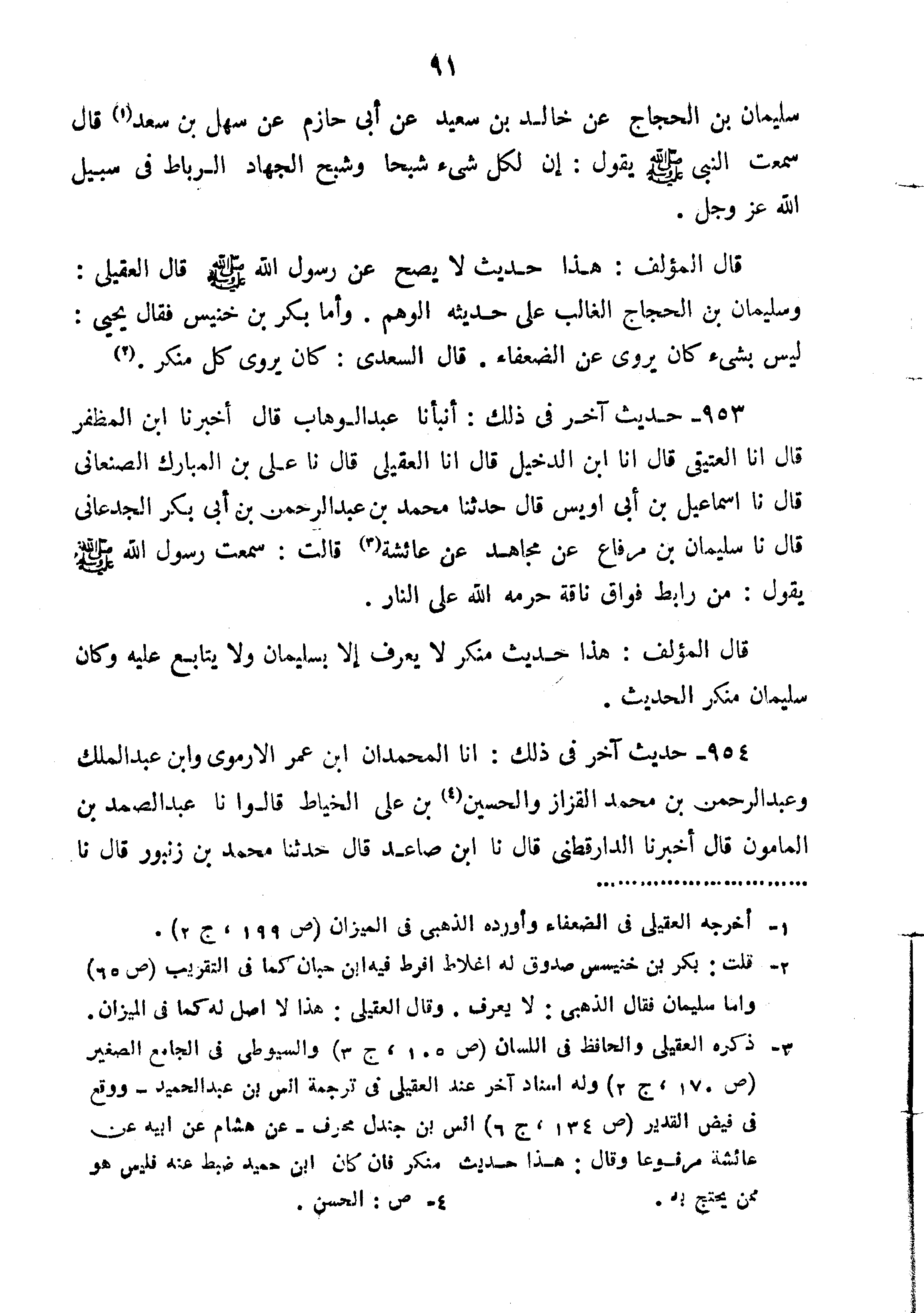 قال العقيلي: "وسليمان ابن الحجاج الغالب على حديثه الوهم وأما بَكْر بْن خنيس فقال يَحْيَى ليس بشيء كان يروي عن الضعفاء قال السعدي كان يروي كل منكر".