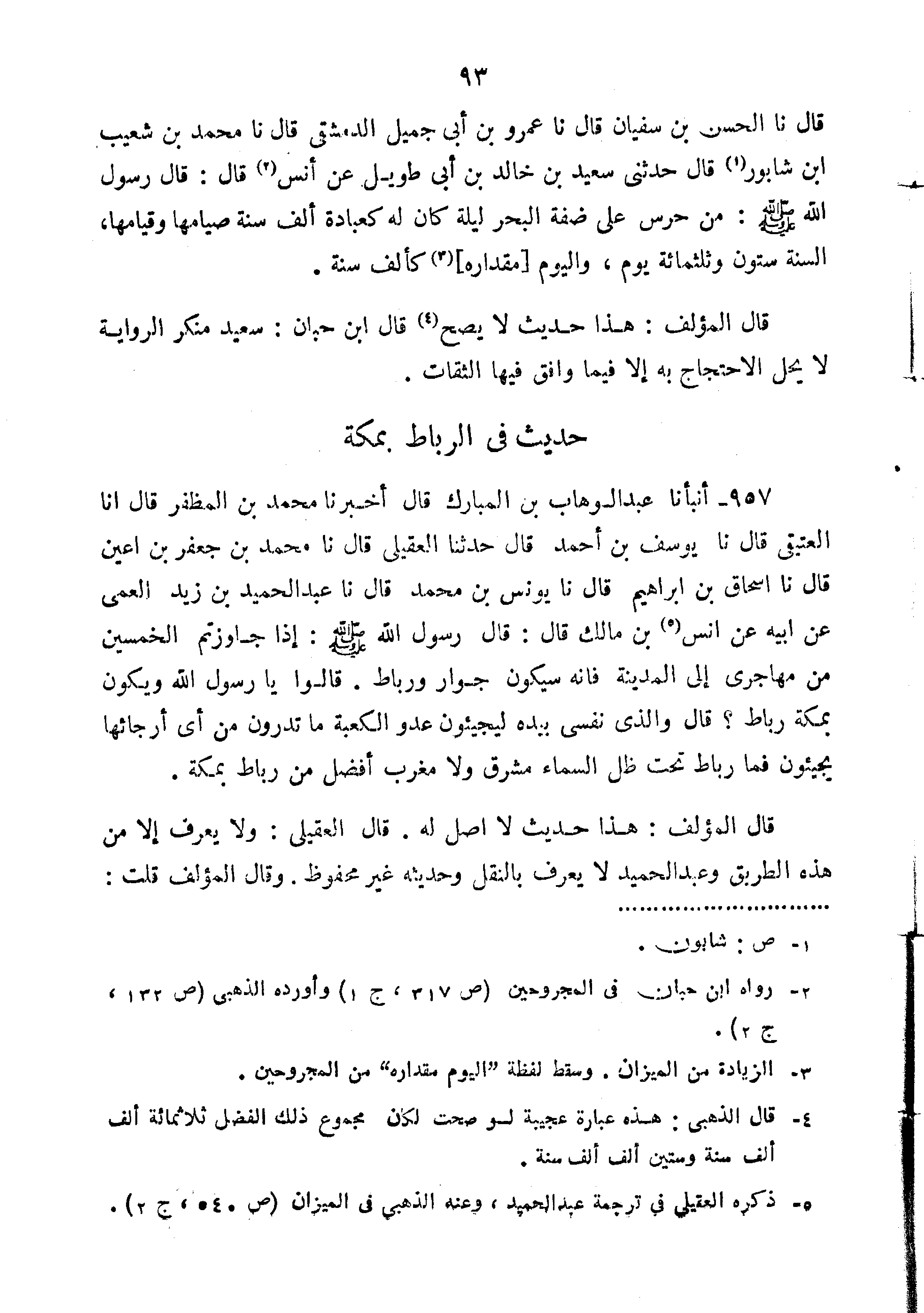 قَالَ نا الْحَسَنُ بْنُ سُفْيَانَ قَالَ نَا عَمْرُو بْنُ أَبِي جَمِيلٍ الدِّمَشْقِيُّ قَالَ نا مُحَمَّدُ بن شعيب ابن شَابُورَ قَالَ حَدَّثَنِي سَعِيدُ بْنُ خالد بن عَنْ أَنَسٍ قَالَ: قَالَ رَسُولُ اللَّهِ صَلَّى اللَّهُ عَلَيْهِ وَسَلَّمَ: "مَنْ حَرَسَ عَلَى ضَفَّةِ الْبَحْرِ لَيْلَةً كَانَ لَهُ كَعِبَادَةِ أَلْفِ سَنَةٍ صِيَامِهَا وَقِيَامِهَا السُّنَّةُ سِتُّونَ وَثَلاثُمِائَةِ يَوْمٍ وَالْيَوْمُ مِقْدَارُهُ كَأَلْفِ سَنَةٍ".