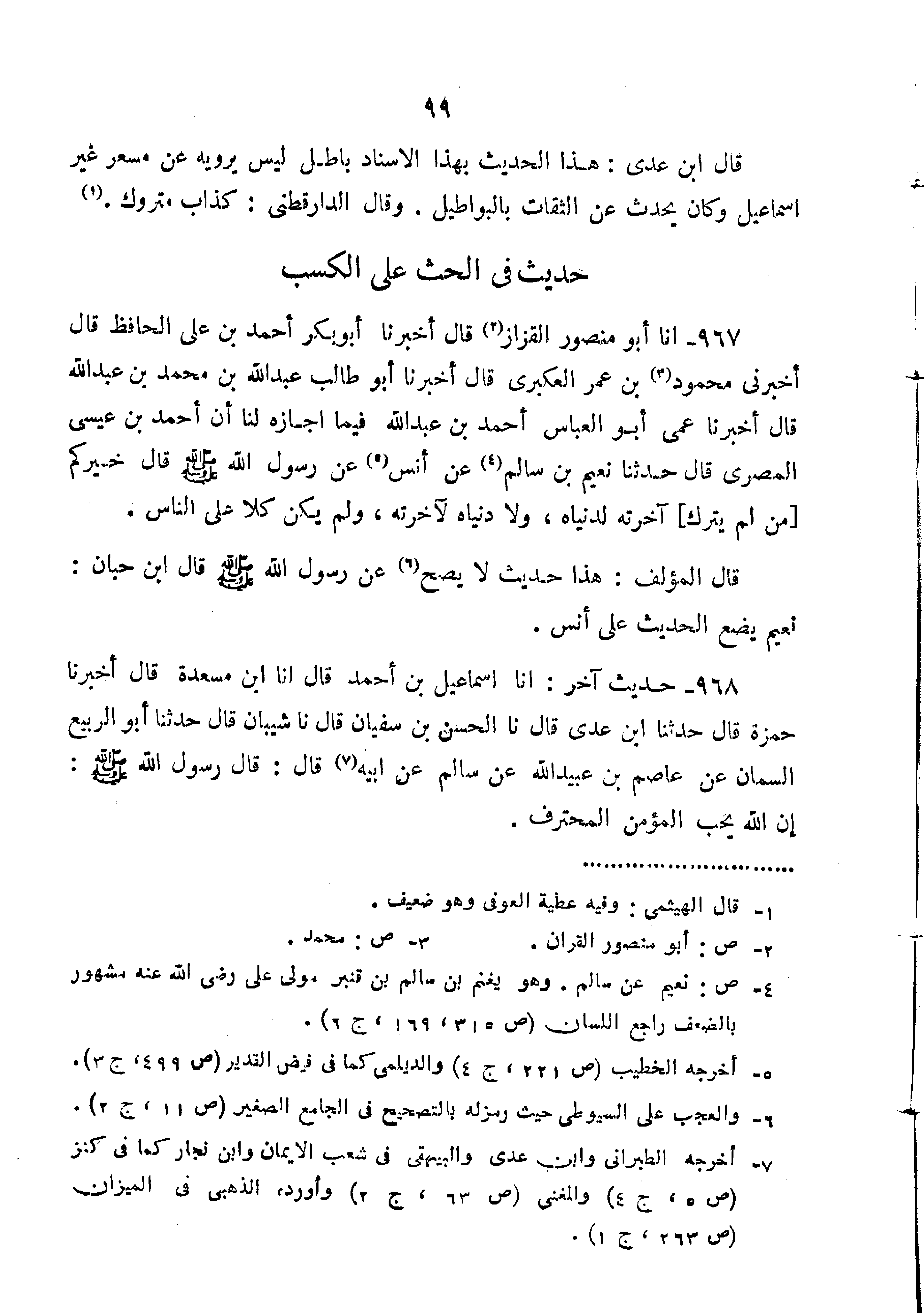 -968حَدِيثٌ آخَرُ أَنَا إِسْمَاعِيلُ بْنُ أَحْمَدَ قَالَ أَنَا ابْنُ مَسْعَدَةَ قَالَ أَخْبَرَنَا حَمْزَةُ قَالَ حَدَّثَنَا ابْنُ عَدِيٍّ قَالَ نا الْحَسَنُ بْنُ سُفْيَانَ قَالَ نا شَيْبَانُ قَالَ حَدَّثَنَا أَبُو الرَّبِيعِ السَّمَّانُ عَنْ عَاصِمِ بْنِ عُبَيْدِ اللَّهِ عَنْ سَالِمٍ عَنْ أَبِيهِ قَالَ: قَالَ رَسُولُ اللَّهِ صَلَّى اللَّهُ عَلَيْهِ وَسَلَّمَ: "إِنَّ اللَّهَ يُحِبُّ الْمُؤْمِنَ الْمُحْتَرِفَ".