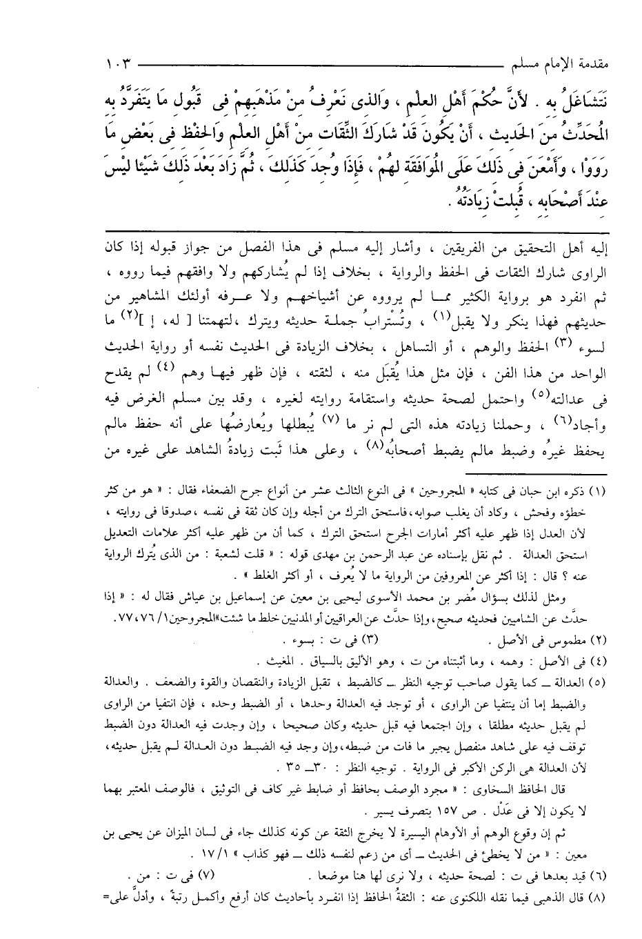 إليه أهل التحقيق من الفريقين، وأشار إليه مسلم فى هذا الفصل من جواز قبوله إذا كان الراوى شارك الثقات فى الحفظ والرواية، بخلاف إذا لم يُشاركهم ولا وافقهم فيما رووه، ثم انفرد هو برواية الكثير مما لم يرووه عن أشياخهم ولا عرفه أولئك المشاهير من حديثهم فهذا ينكر ولا يقبل (¬1)، وتُسْترابُ جملة حديثه ويترك، لتهمتنا [له، إ] (¬2) ما لسوء (¬3) الحفظ والوهم، أو التساهل، بخلاف الزيادة فى الحديث نفسه أو رواية الحديث الواحد من هذا الفن، فإن مثل هذا يُقبَل منه، لثقته، فإن ظهر فيها وهم (¬4) لم يقدح فى عدالته (¬5) واحتمل لصحة حديثه واستقامة روايته لغيره، وقد بين مسلم الغرض فيه وأجاد (¬6)، وحملنا زيادته هذه التى لم نر ما (¬7) يُبطلها ويُعارضُها على أنه حفظ ما لم يحفظ غيرُه وضبط ما لم يضبط أصحابُه (¬8)، وعلى هذا ثبت زيادةُ الشاهد على غيره من