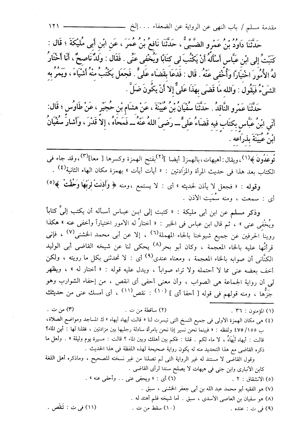 وذكر مسلم عن ابن أبى مليكة: " كتبت إلى ابن عباس أسأله أن يكتب إلىَّ كتاباً ويُخْفِى عنى "، ثم قال ابن عباس فى الخبر: " أختارُ له الأمور اختياراً وأخفى عنه " هكذا روينا الحرفين عن جميع شيوخنا بالحاء المهملة (¬6)، إلا عن أبى محمد الخشنى (¬7)، فإنى قرأتُها عليه بالخاء المعجمة، وكان أبو بحر (¬8) يحكى لنا عن شيخه القاضى أبى الوليد الكنَّانى أن صوابه بالخاء المعجمة، ومعناه عندى (¬9) أى: لا تحدثنى بكل ما رويته، ولكن أخف بعضه عنى مما لا أحتمله ولا تراه صواباً، ويدل عليه قوله: " أختار له "، ويظهر لى أن رواية الجماعة هى الصواب، وأن معنى أحفى أى انقص، من إحفاء الشوارب وهو جَزُّها، ومنه قولهم فى قوله [أحفا أى] (¬10): نقص (¬11)، أى أمسك عنى من حديثك