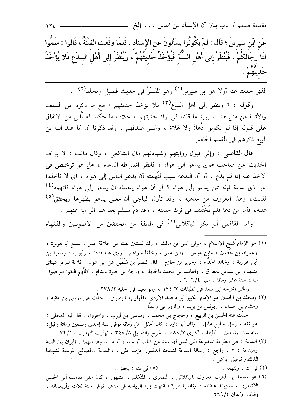 عَنِ ابْنِ سِيرِينَ؛ قَال: لمْ يَكُونُوا يَسْألونَ عَنِ الإِسْنَادِ. فَلمَّا وَقَعَتِ الفِتْنَةُ، قَالوا: سَمُّوا لنَا رِجَالكُمْ. فَيُنْظَرُ إِلى أَهْلِ السُّنَةِ فَيُؤُخَذُ حَدِيثُهُمْ، وَيُنْظَرُ إِلى أَهْلِ البِدَعِ فَلا يُؤْخَذُ حَدِيثُهُمْ.