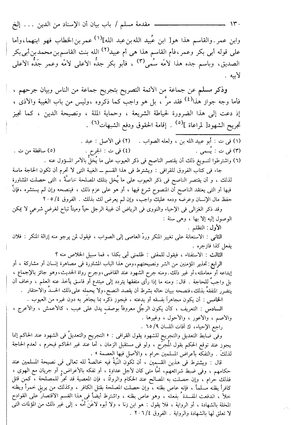 قال: ويشترط فى هذين القسمين، أن تكون النِّيةُ فيه خالصة لله تعالى فى نصيحة المسلمين عند حكامهم، وفى ضبط شرائعهم، أمَّا متى كان لأجل عداوةٍ، أو تفكه بالأعراض، أو جريان مع الهوى، فذلك حرام، وإن حصلت به المصالح عند الحكام والرواة، فإن المعصية قد تجرُّ للمصلحة، كمن قتل كافراً يظنه مسلماً، فإنه عاص بظنه، وإن حصلت المصلحة بقتل الكافر، وكذلك من يريق خمراً ويظنه خلاً، اندفعت المفسدةُ بفعله، وهو عاص بظنه، واشترط أيضاً فى هذا القسم الاقتصارُ على القوادح المخلة بالشهادة، أو الرواية، فلا يقول: هو ابن زنا، ولا أبوه لاعَنَ أمَّه، إلى غير ذلك من المؤلمات التى لا تعلق لها بالشهادة والرواية. الفروق 4/ 206.