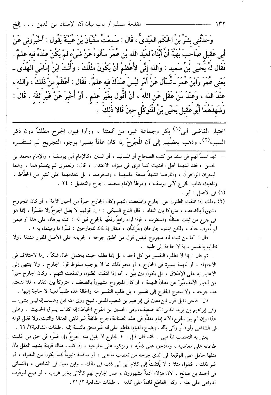 قال: فنحن نقبل قول ابن معين فى إبراهيم بن شعيب المدنى، شيخ روى عنه ابن وهب- إنه ليس بشىء- وفى إبراهيم بن يزيد المدنى: أنه ضعيف، وفى الحسين بن الفرج الخياط: إنه كذاب يسرق الحديث. وعلى هذا، وإن لم يبن الجرح، لأنه إمام مقدَّم فى هذه الصناعة، جرح طائفةٌ غير ثابتى العدالة والثبت. ولا نقبل قوله فى الشافعى ولو فسّر وأتى بألف إيضاح، لقيام القاطع على أنه غير محق بالنسبة إليه. طبقات الشافعية 2/ 22.