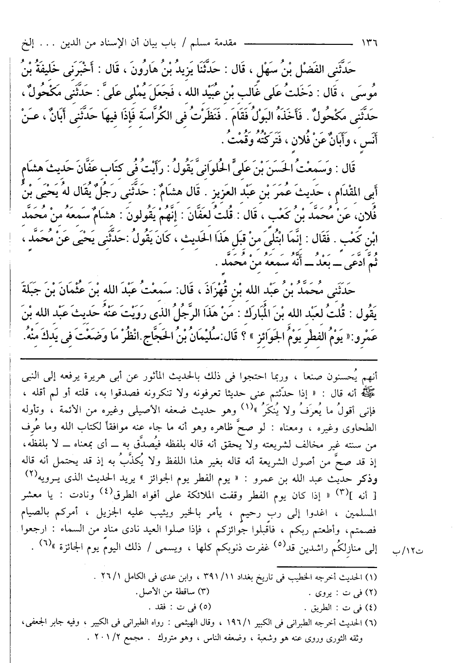 حَدَّثَنِى الفَضْل بْنُ سَهْلٍ، قَال: حَدَّثَنَا يَزِيدُ بْنُ هَارُونَ، قَال: أَخْبَرَنِى خَلِيفَةُ بْنُ مُوسَى، قَال: دَخَلْتُ عَلى غَالِبِ بْنِ عُبَيْدِ اللهِ، فَجَعَلَ يُمْلِى عَلىَّ: حَدَّثَنِى مَكْحُولٌ، حَدَّثَنِى مَكْحُولٌ. فَأَخَذَهُ البَوْلُ فَقَامَ. فَنَظَرْتُ فِى الكُرَّاسَةِ فَإِذَا فِيهَا حَدَّثَنِى أَبَانٌ، عَنْ أَنَسٍ، وَأَبَانٌ عَنْ فُلانٍ، فَتَرَكْتُهُ وَقُمْتُ.