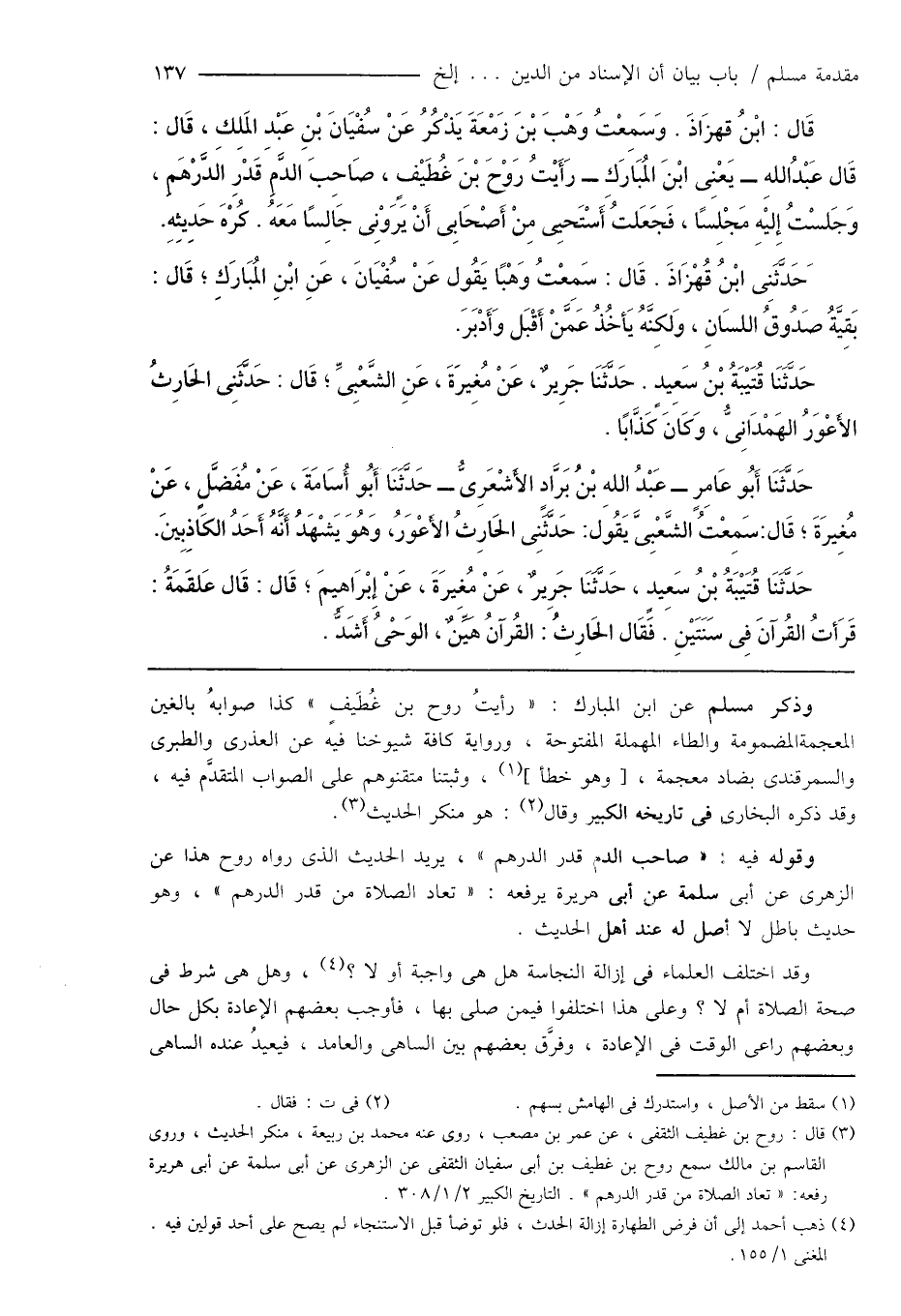 قَال: ابْنُ قهزَاذَ. وَسَمِعْتُ وَهْبَ بْنَ زَمْعَةَ يَذْكُرُ عَنْ سُفْيَانَ بْنِ عَبْدِ المَلِكِ، قَال: قَال عَبْدُ اللهِ - يَعْنِى ابْنَ المُبَارَكِ - رَأَيْتُ رَوْحَ بْنَ غُطَيْفٍ، صَاحِبَ الدَّمِ قَدْرِ الدَّرْهَمِ، وَجَلسْتُ إِليْهِ مَجْلِسًا، فَجَعَلتُ أَسْتَحِيى مِنْ أَصْحَابِى أَنْ يَرَوْنِى جَالِسًا مَعَهُ. كُرْهَ حَدِيثِهِ.
