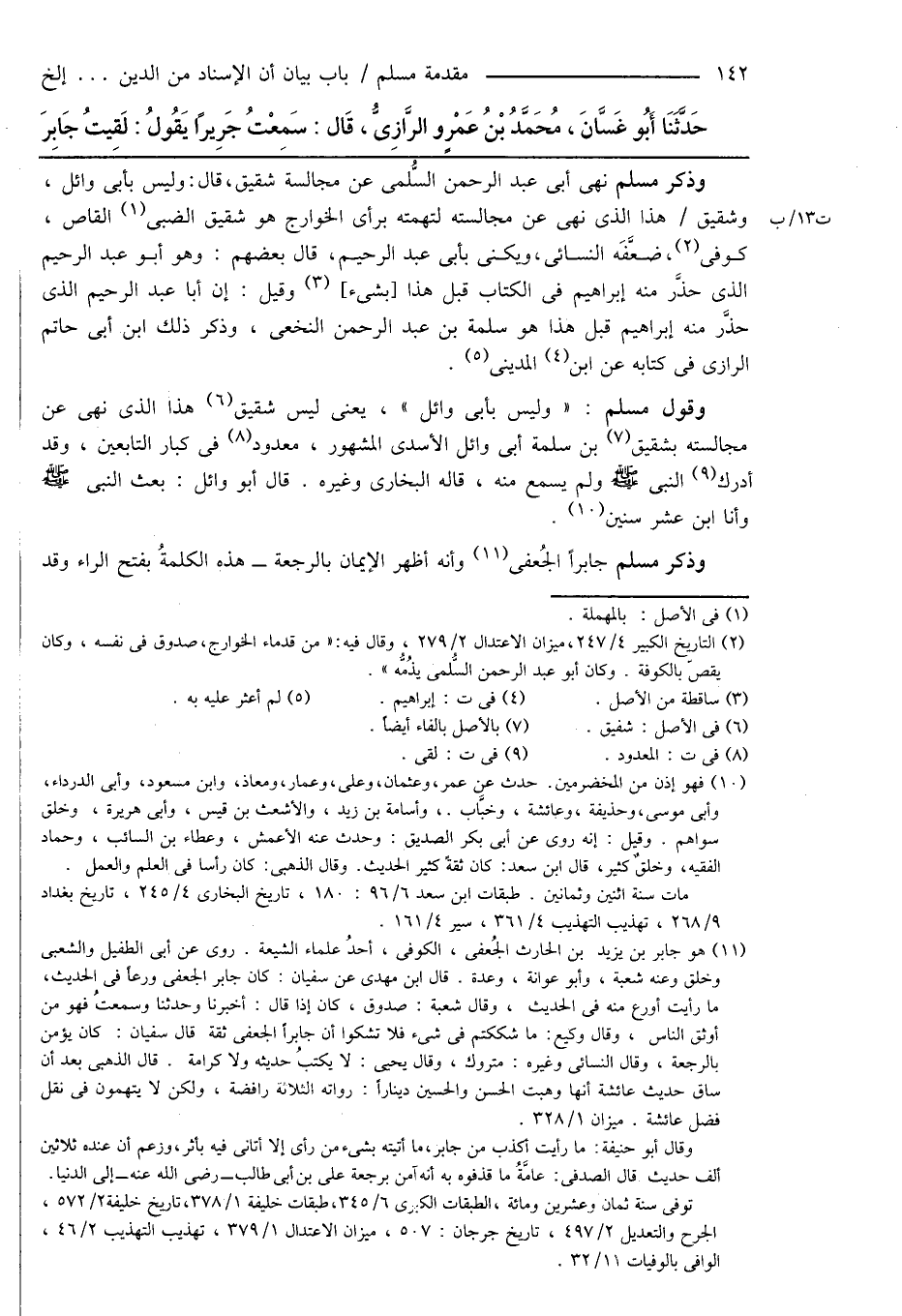 (¬11) هو جابر بن يزيد بن الحارث الجُعفى، الكوفى، أحدُ علماء الشيعة. روى عن أبى الطفيل والشعبى وخلق وعنه شعبة، وأبو عوانة، وعدة. قال ابن مهدى عن سفيان: كان جابر الجعفى ورعاً فى الحديث، ما رأيت أورع منه فى الحديث، وقال شعبة: صدوق، كان إذا قال: أخبرنا وحدثنا وسمعتُ فهو من أوثق الناس، وقال وكيع: ما شككتم فى شىء فلا تشكوا أن جابراً الجعفى ثقة قال سفيان: كان يؤمن بالرجعة، وقال النسائى وغيره: متروك، وقال يحيى: لا يكتبُ حديثه ولا كرامة. قال الذهبى بعد أن ساق حديث عائشة أنها وهبت الحسن والحسين ديناراً: رواته الثلاثة رافضة، ولكن لا يتهمون فى نقل فضل عائشة. ميزان 1/ 328.