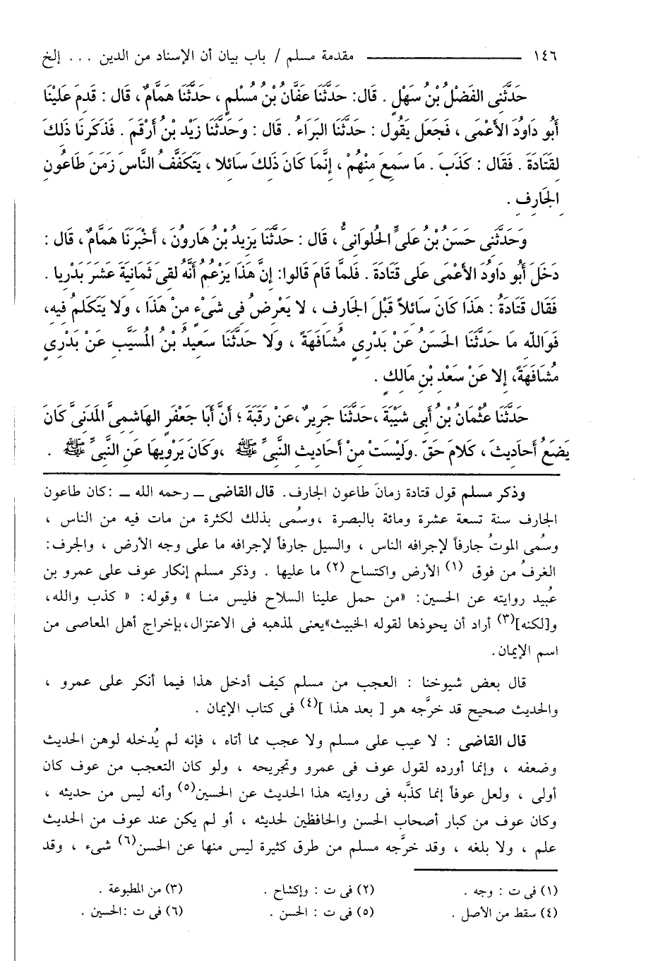 قال القاضى: لا عيب على مسلم ولا عجب مما أتاه، فإنه لم يُدخله لوهن الحديث وضعفه، وإنما أورده لقول عوف فى عمرو وتجريحه، ولو كان التعجب من عوف كان أولى، ولعل عوفاً إنما كذَّبه فى روايته هذا الحديث عن الحسين (¬5) وأنه ليس من حديثه، وكان عوف من كبار أصحاب الحسن والحافظين لحديثه، أو لم يكن عند عوف من الحديث علم، ولا بلغه، وقد خرَّجه مسلم من طرق كثيرة ليس منها عن الحسن (¬6) شىء، وقد