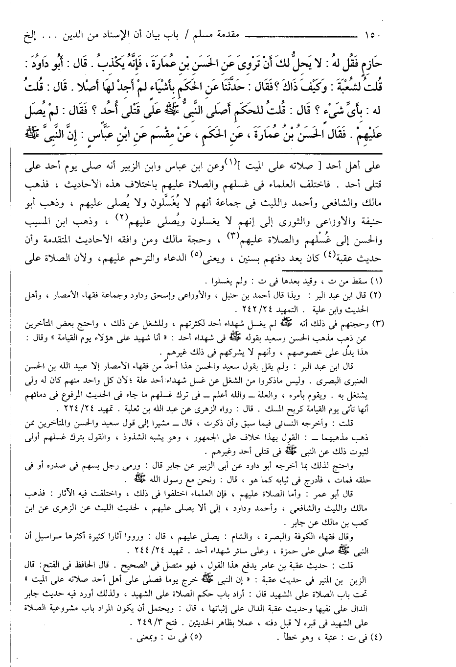 وقال فقهاء الكوفة والبصرة، والشام: يصلى عليهم، قال: ورووا آثاراً كثيرة أكثرها مراسيل أن النبى صَلَّى اللهُ عَلَيْهِ وَسَلَّمَ صلى على حمزة، وعلى سائر شهداء أحد. تمهيد 24/ 244.