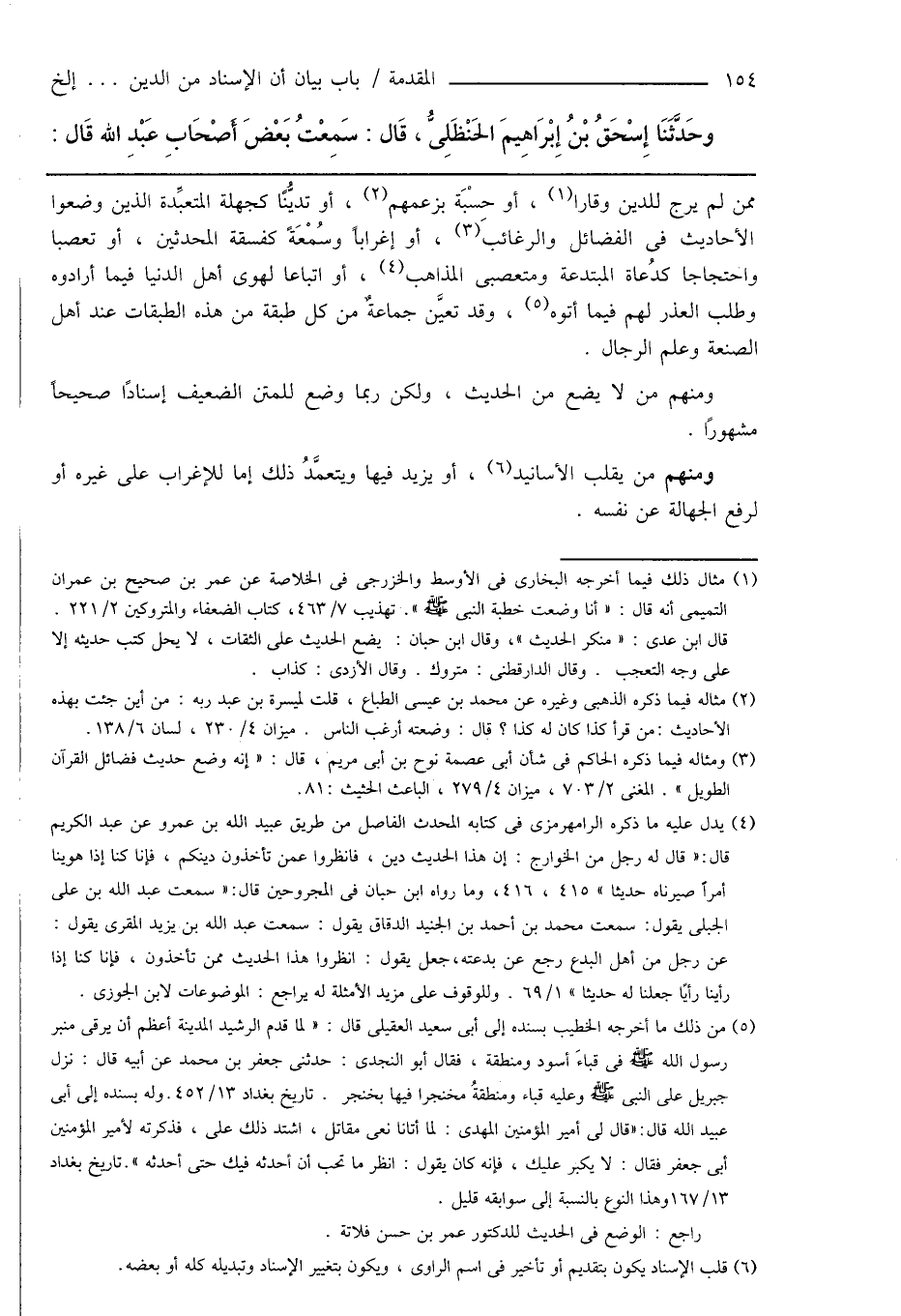 (¬4) يدل عليه ما ذكره الرامهرمزى فى كتابه المحدث الفاصل من طريق عبيد الله بن عمرو عن عبد الكريم قال: " قال له رجل من الخوارج: إن هذا الحديث دين، فانظروا عمن تأخذون دينكم، فإنا كنا إذا هوينا أمراً صيرناه حديثاً " 415، 416، وما رواه ابن حبان فى المجروحين قال: " سمعت عبد الله بن على الجبلى يقول: سمعت محمد بن أحمد بن الجنيد الدقاق يقول: سمعت عبد الله بن يزيد المقرى يقول: عن رجل من أهل البدع رجع عن بدعته، جعل يقول: انظروا هذا الحديث ممن تأخذون، فإنا كنا إذا رأينا رأيًا جعلنا له حديثاً " 1/ 69. وللوقوف على مزيد الأمثلة له يراجع: الموضوعات لابن الجوزى.