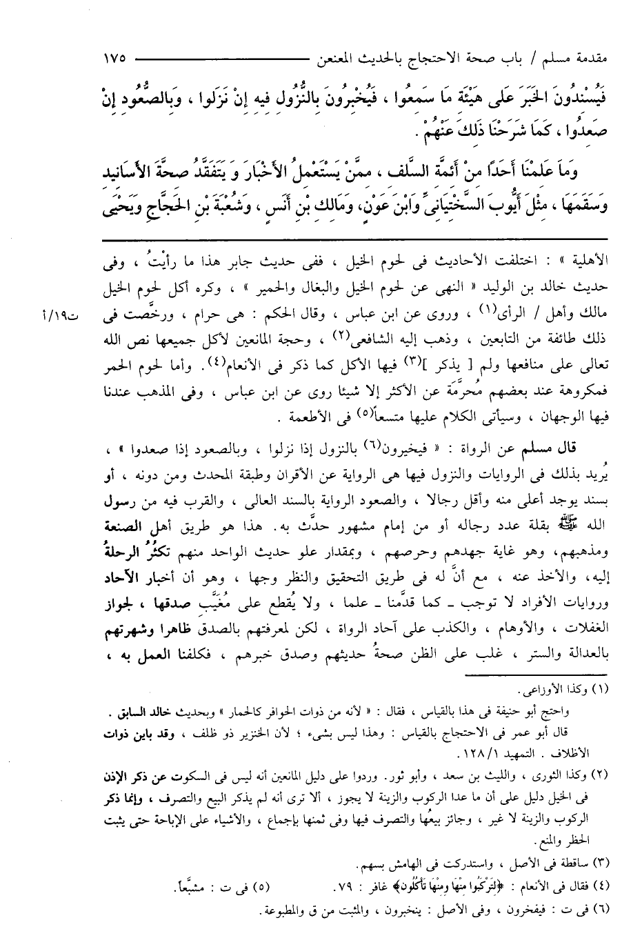 قال مسلم عن الرواة: " فيخيرون (¬6) بالنزول إذا نزلوا، وبالصعود إذا صعدوا "، يُريد بذلك فى الروايات والنزول فيها هى الرواية عن الأقران وطبقة المحدث ومن دونه، أو بسند يوجد أعلى منه وأقل رجالاً، والصعود الرواية بالسند العالى، والقرب فيه من رسول الله صَلَّى اللهُ عَلَيْهِ وَسَلَّمَ بقلة عدد رجاله أو من إمام مشهور حدَّث به. هذا هو طريق أهل الصنعة ومذهبهم، وهو غاية جهدهم وحرصهم، وبمقدار علو حديث الواحد منهم تكثُرُ الرحلةُ إليه، والأخذ عنه، مع أنَّ له فى طريق التحقيق والنظر وجهاً، وهو أن أخبار الآحاد وروايات الأفراد لا توجب- كما قدَّمنا- علماً، ولا يُقطع على مُغَيَّبِ صدقها، لجواز الغفلات، والأوهام، والكذب على آحاد الرواة، لكن لمعرفتهم بالصدق ظاهراً وشهرتهم بالعدالة والستر، غلب على الظن صحةُ حديثهم وصدق خبرهم، فكلفنا العمل به،