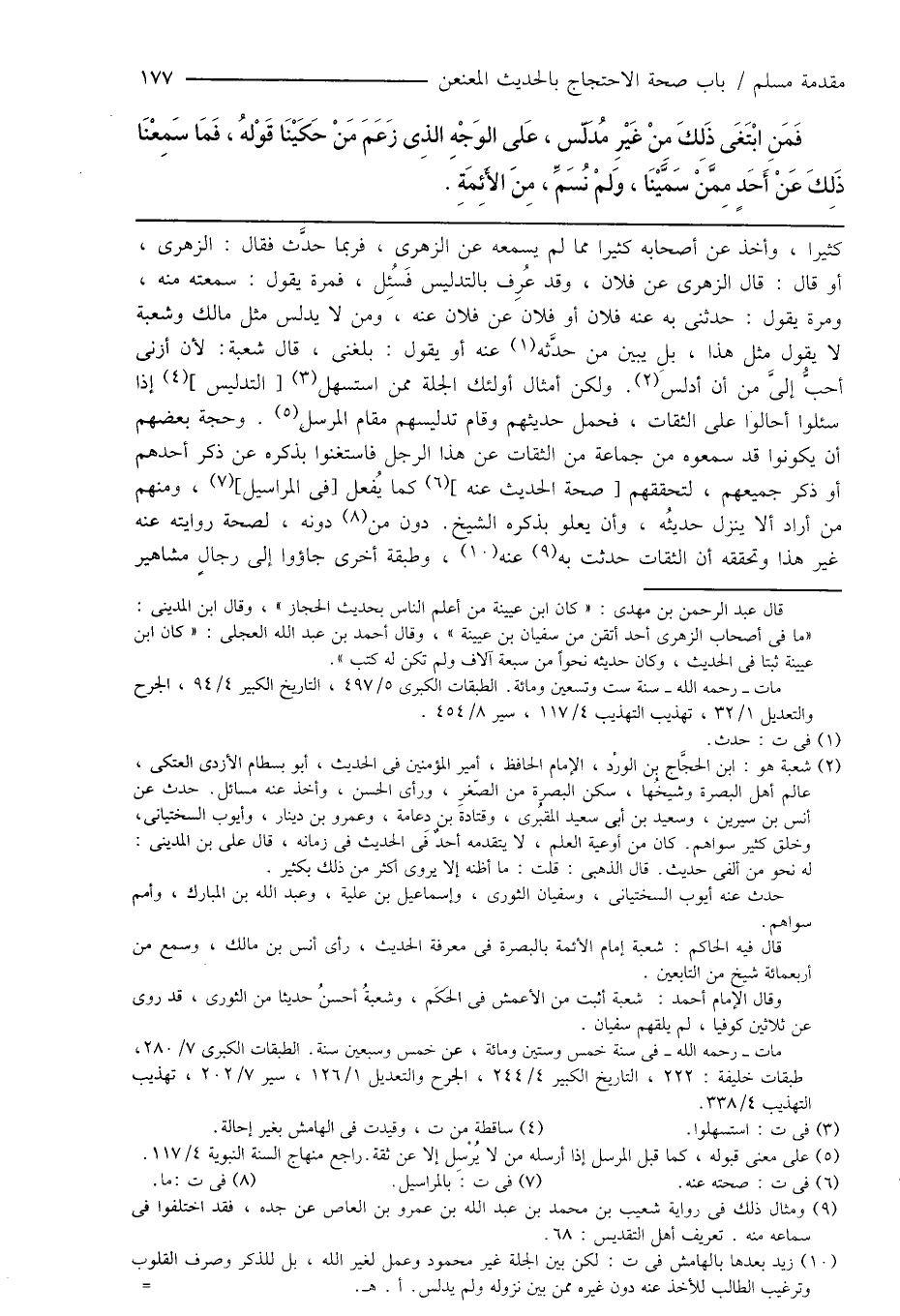 (¬2) شعبة هو: ابن الحجَّاج بن الورْد، الإمام الحافظ، أمير المؤمنين فى الحديث، أبو بسطام الأزدى العتكى، عالم أهل البصرة وشيخُها، سكن البصرة من الصّغرِ، ورأى الحسن، وأخذ عنه مسائل. حدث عن أنس بن سيرين، وسعيد بن أبى سعيد المقبُرى، وقتادةَ بن دِعامة، وعمرو بن دينار، وأيوب السختيانى، وخلق كثير سواهم. كان من أوعية العلم، لا يتقدمه أحدٌ فى الحديث فى زمانه، قال على بن المدينى: له نحو من ألفى حديث. قال الذهبى: قلت: ما أظنه إلا يروى أكثر من ذلك بكثير.
