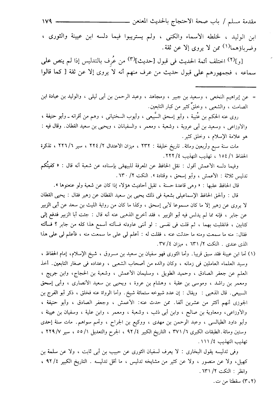 قال: وألحق الحافظ الإسماعيلى بشعبة فى ذلك يحيى بن سعيد القطان عن زهير فقال: يحيى القطان لا يروى عن زهير إلا ما كان مسموعاً لأبى إسحاق، وكذا ما كان من رواية الليث بن سعد عن أبى الزبير عن جابر، فإنه مما لم يدلس فيه أبو الزبير، فقد أخرج الذهبى عنه أنه قال: جئت أبا الزبير فدفع إلى كتابين، فانقلبت بهما، ثم قلت فى نفسى: لو أننى عاودته فسألته أسمع هذا كله من جابر؟ فسألته فقال: منه ما سمعت ومنه ما حدثت عنه، فقلت له: أعلم لى على ما سمعت منه، فأعلم لى على هذا الذى عندى. النكت 2/ 631، ميزان 4/ 37.