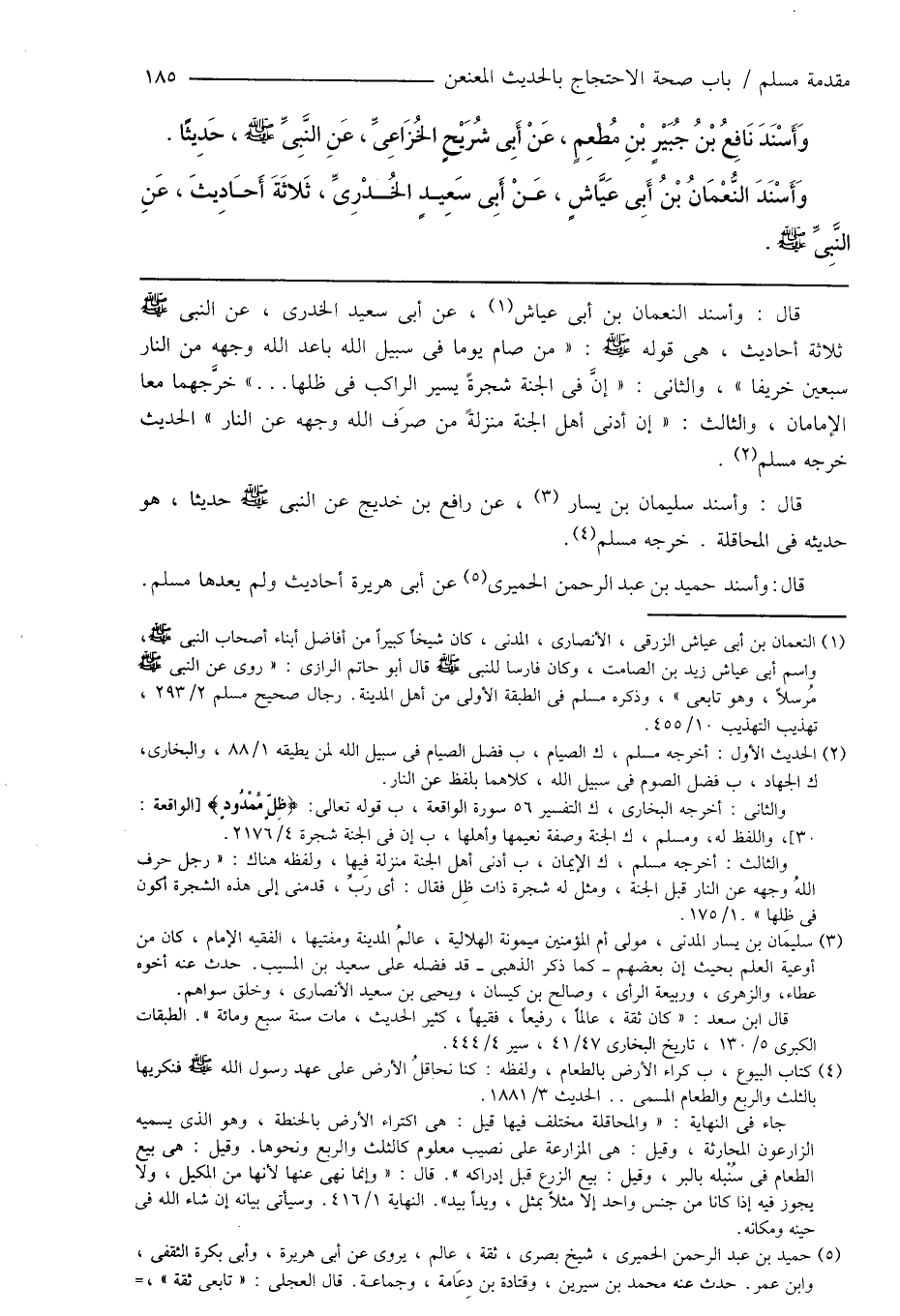 (¬1) النعمان بن أبى عياش الزرقى، الأنصارى، المدنى، كان شيخاً كبيراً من أفاضل أبناء أصحاب النبى صَلَّى اللهُ عَلَيْهِ وَسَلَّمَ، وأسم أبى عياش زيد بن الصامت، وكان فارساً للنبى صَلَّى اللهُ عَلَيْهِ وَسَلَّمَ قال أبو حاتم الرازى: " روى عن النبى صَلَّى اللهُ عَلَيْهِ وَسَلَّمَ مُرسلاً، وهو تابعى "، وذكره مسلم فى الطبقة الأولى من أهل المدينة. رجال صحيح مسلم 2/ 293، تهذيب التهذيب 10/ 455.