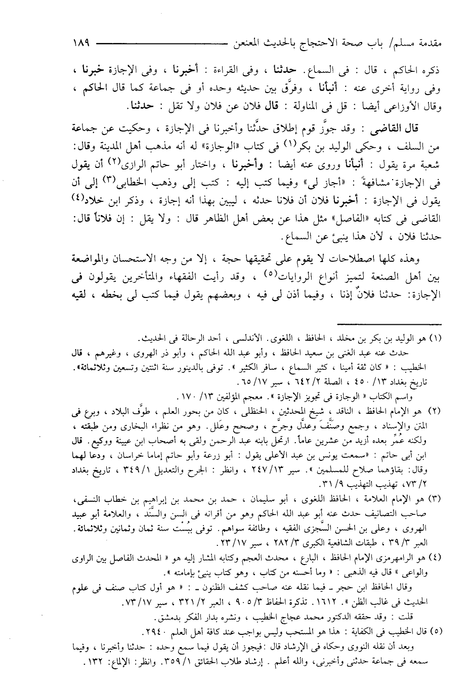 وهذه كلها اصطلاحات لا يقوم على تحقيقها حجة، إلا من وجه الاستحسان والمواضعة بين أهل الصنعة لتميز أنواع الروايات (¬5)، وقد رأيت الفقهاء والمتأخرين يقولون فى الإجازة: حدثنا فلانٌ إذناً، وفيما أذن لى فيه، وبعضهم يقول فيما كتب لى بخطه، لقيه