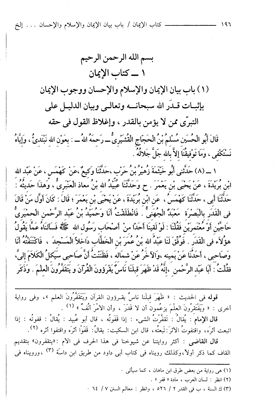 (1) باب بيان الإيمان والإسلام والإحسان ووجوب الإيمان بإثبات قدَر الله سبحانه وتعالى وبيان الدليل على التبرّى ممن لا يؤمن بالقدر، وإغلاظ القول فى حقه