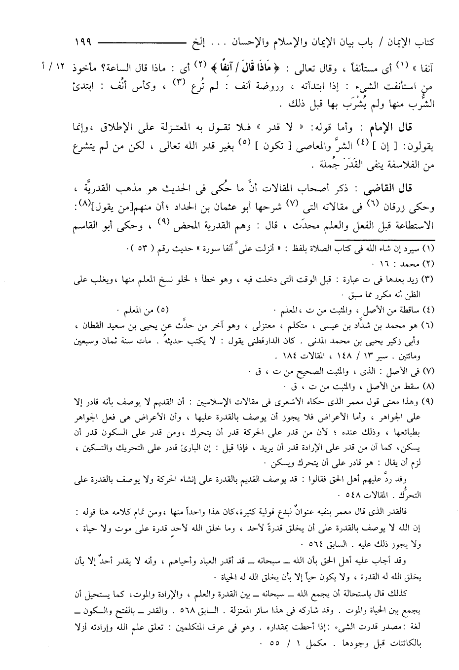 قال القاضى: ذكر أصحاب المقالات أَنَّ ما حُكى فى الحديث هو مذهب القدريَّة، وحكى زرقان (¬6) فى مقالاته التى (¬7) شرحها أبو عثمان بن الحداد؛ أن منهم [من يقول] (¬8): الاستطاعة قبل الفعل والعلم محدَث، قال: وهم القدرية المحض (¬9)، وحكى أبو القاسم