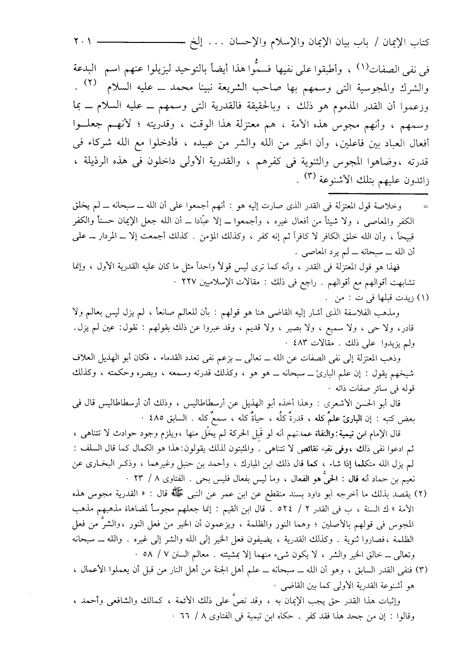 (¬2) يقصد بذلك ما أخرجه أبو داود بسند منقطع عن ابن عمر عن النبى صَلَّى اللهُ عَلَيْهِ وَسَلَّمَ قال: " القدرية مجوس هذه الأمة " ك السنة، ب فى القدر 2/ 524. قال ابن القيم: إنما جعلهم مجوساً لمضاهاة مذهبهم مذهب المجوس فى قولهم بالأصلين؛ وهما النور والظلمة، ويزعمون أن الخير من فعل النور، والشَّر من فعل الظلمة، فصاروا ثنوية. وكذلك القدرية، يضيفون فعل الخير إلى الله والشر إلى غيره. والله -سبحانه وتعالى- خالق الخير والشر، لا يكون شىء منهما إلا بمشيئته. معالم السنن 7/ 58.