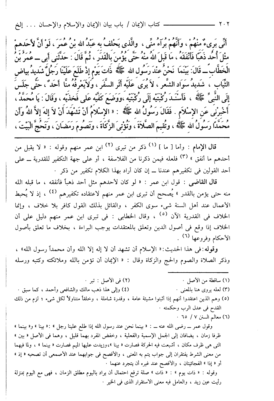 قال القاضى: قول ابن عمر: " لو كان لأحدهم مثل أحد ذهباً فأنفقه، ما قبله الله منه حتى يؤمن بالقدر " يُصحح أن تبرى ابن عمر منهم لاعتقاده تكفيرهم (¬4)، إذ لا يُحبط الأعمال عند أهل السنة شىء سوى الكفر، والقائل بذلك القول كافر بلا خلاف، وإنما الخلاف فى القدرية الآن (¬5)، وقال الخطابى: فى تبرى ابن عمر منهم دليل على أن الخلاف إذا وقع فى أصول الدين وتعلق بالمعتقدات يوجب البراءة، بخلاف ما تعلق بأصول الأحكام وفروعها (¬6).