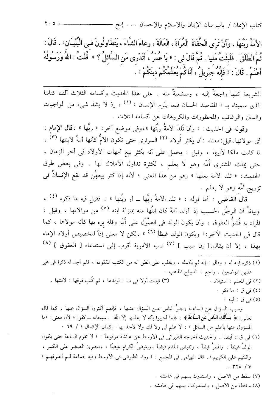 الأَمَةُ رَبَّتَهَا، وَأَنْ تَرَى الْحُفَاةَ الْعُرَاةَ، الْعَالَةَ، رِعاءَ الشَّاءَ، يَتَطَاولُونَ فِى الْبُنْيَانِ ". قَالَ: ثُمَّ انْطَلَقَ. فَلَبِثْتُ مَلِيا. ثُمَّ قَالَ لِى: " يَا عُمَرُ، أَتَدْرِى مَنِ السَّائِلُ؟ " قُلْتُ: اللهُ وَرَسُولُهُ أَعْلَمُ. قَالَ: " فَإِنَّهُ جِبْرِيلُ، أَتَاكُمْ يُعَلِّمُكُمْ دِينَكُمْ ".