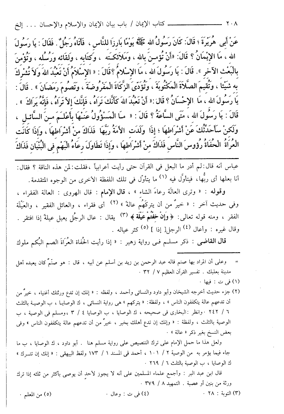 عَنْ أَبِى هُرَيْرَةَ؛ قَالَ: كَانَ رَسُولُ اللهِ صَلَّى اللهُ عَلَيْهِ وَسَلَّمَ يَوْمًا بَارِزًا لِلنَّاسِ، فَأَتَاهُ رَجُلٌ. فَقَالَ: يَا رَسُولَ اللهِ، مَا الإِيْمَانُ؟ قَالَ: " أَنْ تُؤمِنَ بِاللهِ، وَمَلَائِكَتَهِ، وَكِتَابِهِ، وَلِقَائِهِ وَرُسُلِهِ، وَتُؤْمِنَ بِالْبَعْثِ الآخِرِ ". قَالَ: يَا رَسُولَ اللهِ، مَا الإِسْلامُ؟ قَالَ: " الإِسْلَامُ أَنْ تَعْبُدَ اللهَ وَلَا تُشْرِكَ بِهِ شَيْئًا، وَتُقِيمَ الصَّلَاةَ الْمَكْتُوبَةَ، وَتُؤَدّىَ الزَّكَاةَ الْمَفْرُوضَةَ، وَتَصُومَ رَمَضَانَ ". قَالَ: يَاَ رَسُولَ اللهِ، مَا الإِحْسَانُ؟ قَالَ: " أَنْ تَعْبُدَ اللهَ كَأَنَّكَ تَرَاهُ، فَإِنَّكَ إِلَّا تَرَاهُ، فَإِنَّهُ يَرَاكَ ". قَالَ: يَا رَسُولَ اللهِ، مَتَى السَّاعَةُ؟ قَالَ: " مَا الْمَسْؤُولُ عَنْهَا بِأَعْلَمَ مِنَ السَّائِلِ، وَلَكنْ سَأحَدِّثُكَ عَنْ أَشْرَاطِهَا؛ إِذَا وَلَدَتِ الأَمَةُ رَبَّهَا فَذَاكَ مِنْ أَشْرَاطِهَا، وَإِذَا كَانَتِ الْعُراةُ الْحُفَاةُ رُؤوسَ النَّاسِ فَذَاكَ مِنْ أَشْرَاطِهَا، وَإِذَا تَطَاوَلَ رِعَاءُ الْبَهْمِ فِى الْبُنْيَانِ فَذَاكَ