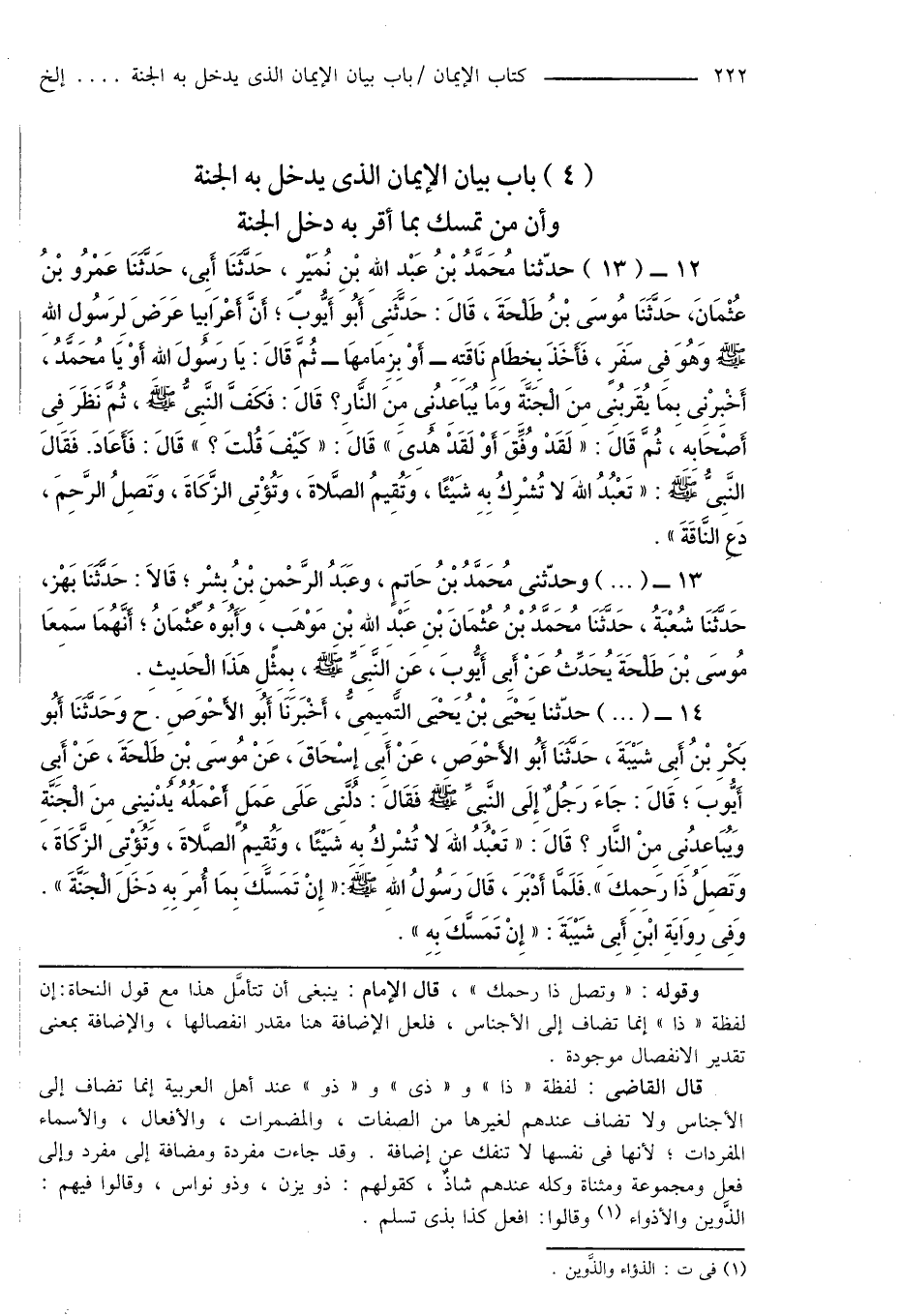 14 - (...) حدّثنا يَحْيَى بْنُ يَحْيَى التَّمِيمِىُّ، أَخْبَرَنَا أَبُو الأَحْوَصِ. ح وَحَدَّثَنَا أَبُو بَكْرِ بْنُ أَبِى شَيْبَةَ، حَدَّثَنَا أَبُو الأَحْوَصِ، عَنْ أَبِى إِسْحَاقَ، عَنْ مُوسَى بْنِ طَلْحَةَ، عَنْ أَبِى أَيُّوبَ؛ قَالَ: جَاءَ رَجُلٌ إِلَى النَّبِىِّ صَلَّى اللهُ عَلَيْهِ وَسَلَّمَ فَقَالَ: دُلَّنِى عَلَى عَمَلٍ أَعْمَلُهُ يُدْنِينِى مِنَ الْجَنَّةِ وَيُبَاعِدُنِى مِنْ النَّارِ؟ قَالَ: " تَعْبُدُ اللهَ لا تُشْرِكُ به شَيْئًا، وَتُقِيمُ الصَّلاةَ، وَتُؤْتِى الزَّكَاةَ، وَتَصِلُ ذَا رَحِمِكَ ". فَلَمَّا أَدْبَرَ، قَالَ رَسُولُ اللهِ صَلَّى اللهُ عَلَيْهِ وَسَلَّمَ: " إِنْ تَمَسَّكَ بِمَا أُمِرَ بِهِ دَخَلَ الْجَنَّةَ ". وَفِى رِوَايَةِ ابْنَ أَبِى شَيْبَةَ: " إِنْ تَمَسَّكَ بِهِ ".