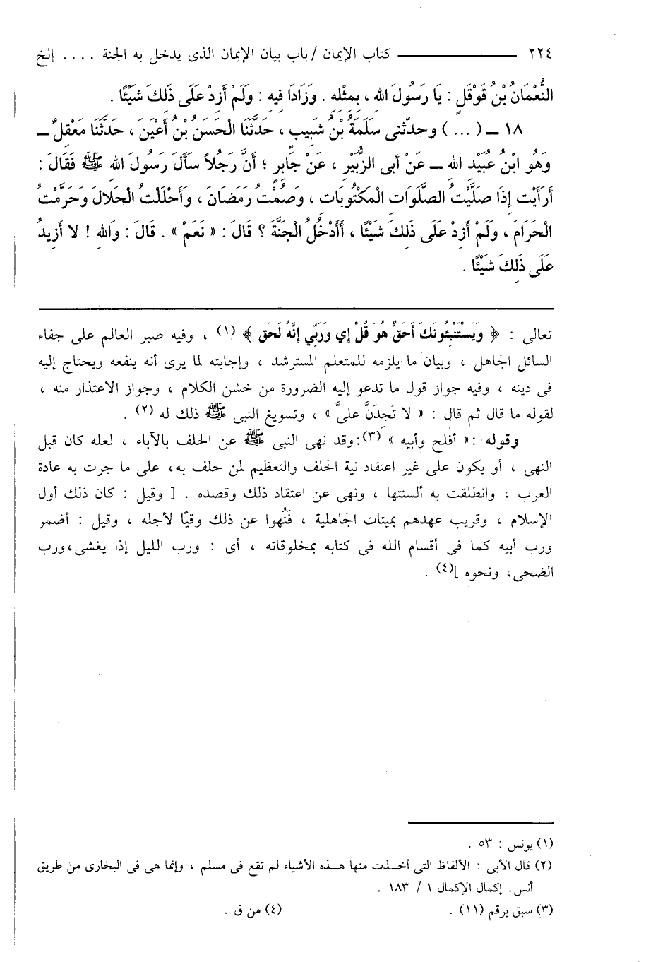 18 - (...) وحدّثنى سَلَمَةُ بْنُ شَبِيبٍ، حَدَّثَنَا الْحَسَنُ بْنُ أَعْيَنَ، حَدَّثَنَا مَعْقِلٌ - وَهُو ابْنُ عُبَيْدِ اللهِ - عَنْ أَبِى الزُّبَيْرِ، عَنْ جَابِرٍ؛ أَنَّ رَجُلاً سَأَلَ رَسُولَ اللهِ صَلَّى اللهُ عَلَيْهِ وَسَلَّمَ فَقَالَ: أَرَأَيْت إِذَا صَلَّيْتُ الصَّلَوَاتِ الْمَكْتُوبَاتِ، وَصُمْتُ رَمَضَانَ، وَأَحْلَلتُ الْحَلَالَ وَحَرَّمْتُ الْحَرَامَ، وَلَمْ أَزِدْ عَلَى ذَلِكَ شَيْئًا، أَأَدْخُلُ الْجَنَّةَ؟ قَالَ: " نَعَمْ ". قَالَ: وَاللهِ! لا أَزِيدُ عَلَى ذَلِكَ شَيْئًا.