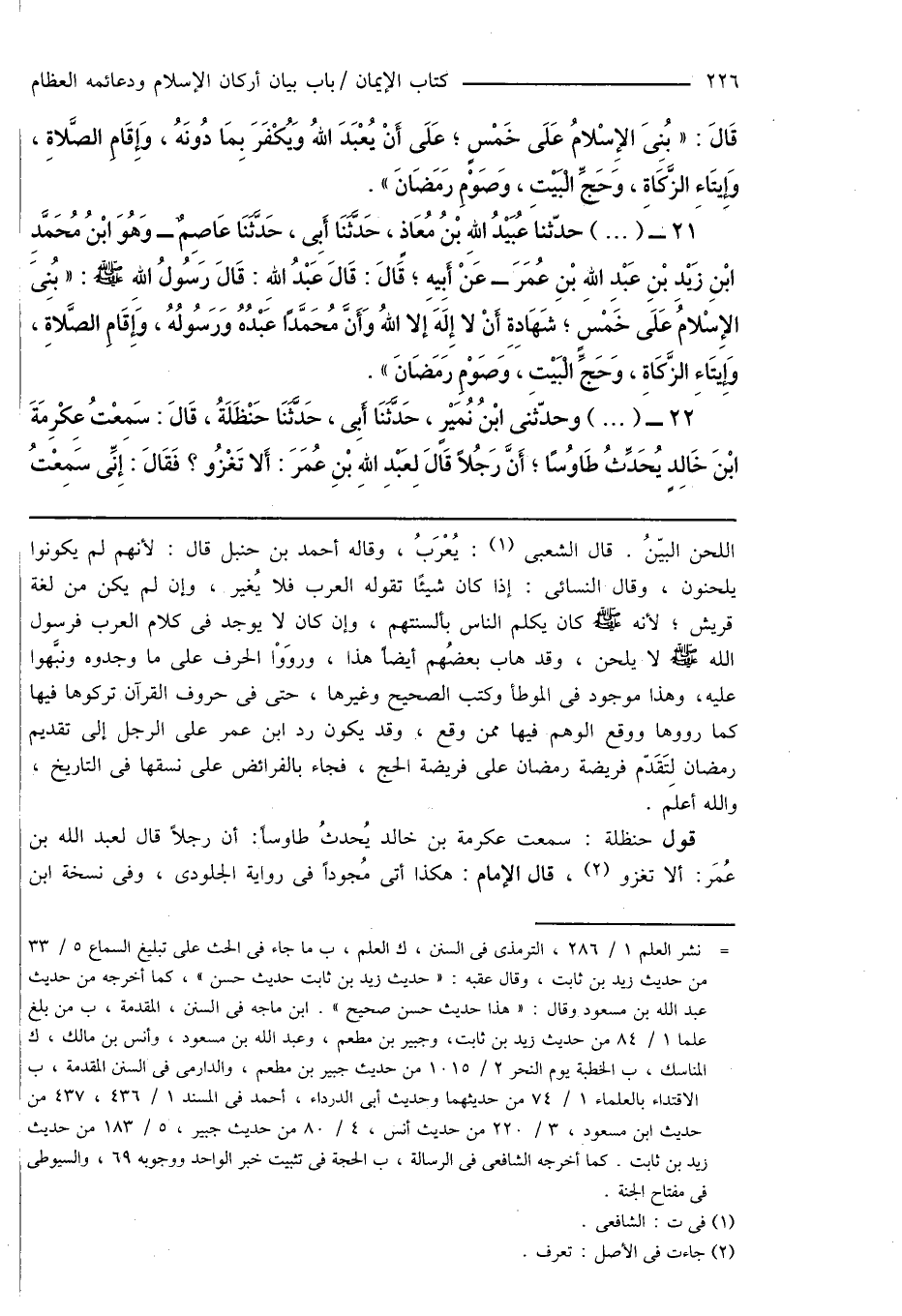 21 - (...) حدّثنا عُبَيْدُ اللهِ بْنُ مُعَاذٍ، حَدَّثَنَا أَبِى، حَدَّثَنَا عَاصِمٌ - وَهُوَ ابْنُ مُحَمَّدِ ابْنِ زَيْدِ بْنِ عَبْدِ اللهِ بْنِ عُمَرَ - عَنْ أَبِيهِ؛ قَالَ: قَالَ عَبْدُ اللهِ: قَالَ رَسُولُ اللهِ صَلَّى اللهُ عَلَيْهِ وَسَلَّمَ: " بُنِىَ الإِسْلامُ عَلَى خَمْسٍ؛ شَهَادةِ أَنْ لا إِلَهَ إِلا اللهُ وَأَنَّ مُحَمَّدًا عَبْدُهُ وَرَسُولُهُ، وَإِقَامِ الصَّلاةِ، وَإِيتَاءِ الزَّكَاةِ، وَحَجِّ الْبَيْتِ، وَصَوْمِ رَمَضَانَ ".