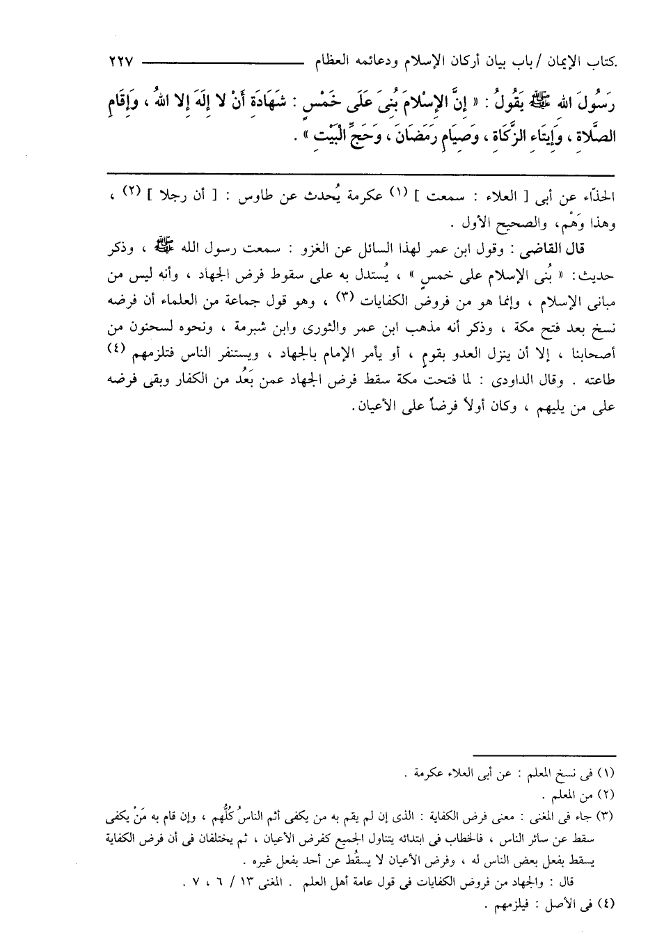 قال القاضى: وقول ابن عمر لهذا السائل عن الغزو: سمعت رسول الله صَلَّى اللهُ عَلَيْهِ وَسَلَّمَ، وذكر حديث: " بُنى الإسلام على خمسٍ "، يُستدل به على سقوط فرض الجهاد، وأنه ليس من مبانى الإسلام، وإنما هو من فروض الكفايات (¬3)، وهو قول جماعة من العلماء أن فرضه نسخ بعد فتح مكة، وذكر أنه مذهب ابن عمر والثورى وابن شبرمة، ونحوه لسحنون من أصحابنا، إلا أن ينزل العدو بقومٍ، أو يأمر الإمام بالجهاد، ويستنفر الناس فتلزمهم (¬4) طاعته. وقال الداودى: لما فتحت مكة سقط فرض الجهاد عمن بَعُد من الكفار وبقى فرضه على من يليهم، وكان أولاً فرضاً على الأعيان.