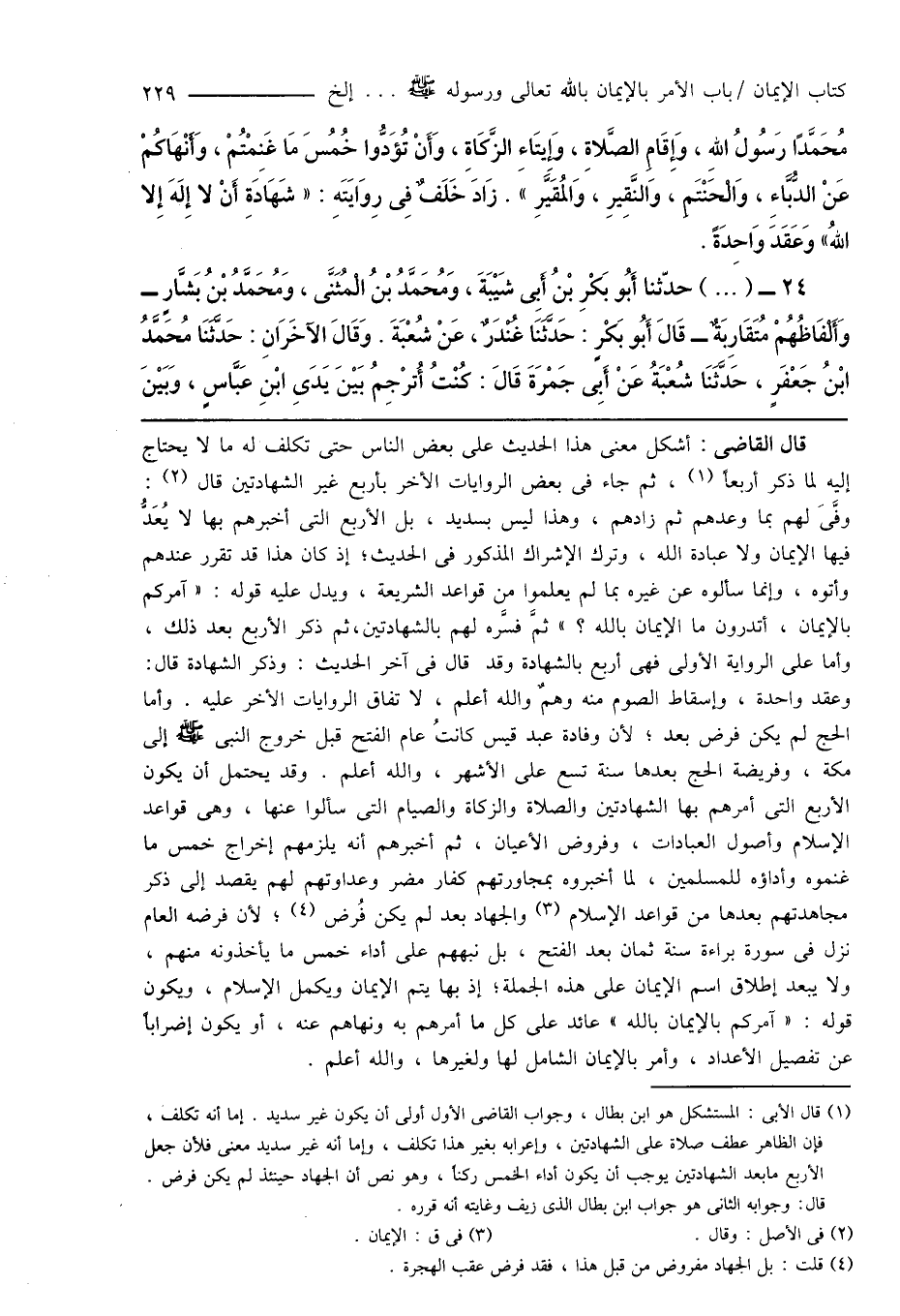 (¬1) قال الأبى: المستشكل هو ابن بطال، وجواب القاضى الأول أولى أن يكون غير سديد. إما أنه تكلف، فإن الظاهر عطف صلاة على الشهادتين، وإعرابه بغير هذا تكلف، وإما أنه غير سديد معنى فلأن جعل الأربع مابعد الشهادتين يوجب أن يكون أداء الخمس ركناً، وهو نص أن الجهاد حينئذ لم يكن فرض. قال: وجوابه الثانى هو جواب ابن بطال الذى زيف وغايته أنه قرره.