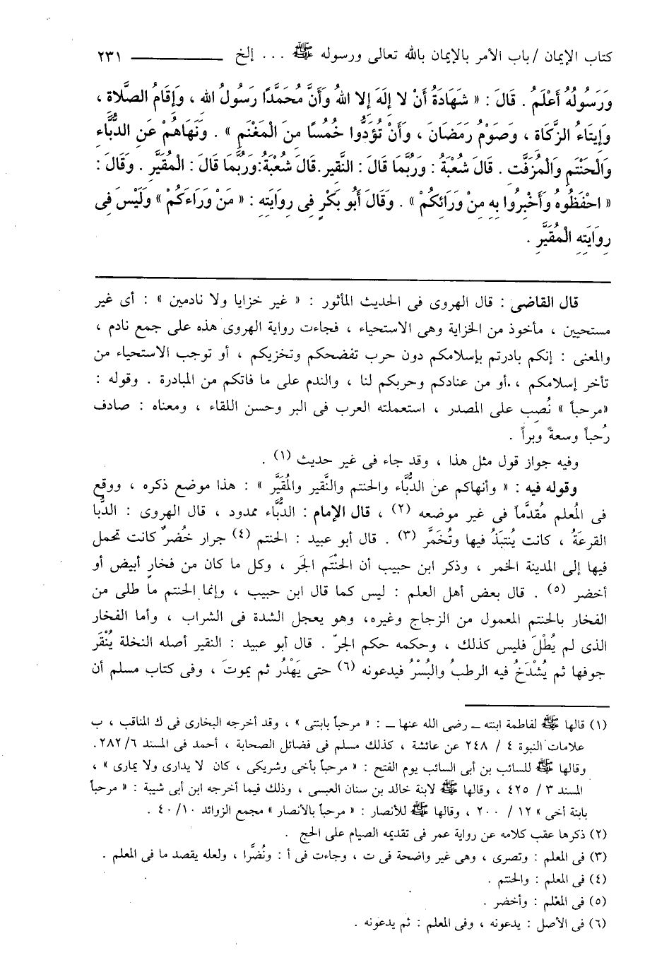 وقوله فيه: " وأنهاكم عن الدُّبَّاء والحنتم والنَّقير والمُقَيَّر ": هذا موضع ذكره، ووقع فى المُعلم مُقدَّماً فى غير موضعه (¬2)، قال الإمام: الدُّبَّاء ممدود، قال الهروى: الدُّبا القرعَةُ، كانت يُنتبَذُ فيها وتُخَمَّر (¬3). قال أبو عبيد: الحنتم (¬4) جرار خُضرٌ كانت تحمل فيها إلى المدينة الخمر، وذكر ابن حبيب أن الحنْتَم الجَر، وكل ما كان من فخارٍ أبيض أو أخضر (¬5). قال بعض أهل العلم: ليس كما قال ابن حبيب، وإنما الحنتم ما طلى من الفخار بالحنتم المعمول من الزجاج وغيره، وهو يعجل الشدة فى الشراب، وأما الفخار الذى لم يُطْلَ فليس كذلك، وحكمه حكم الجرّ. قال أبو عبيد: النقير أصله النخلة يُنْقَر جوفها ثم يُشْدَخُ فيه الرطبُ والبُسْرُ فيدعونه (¬6) حتى يَهْدُر ثم يموتَ، وفى كتاب مسلم أن