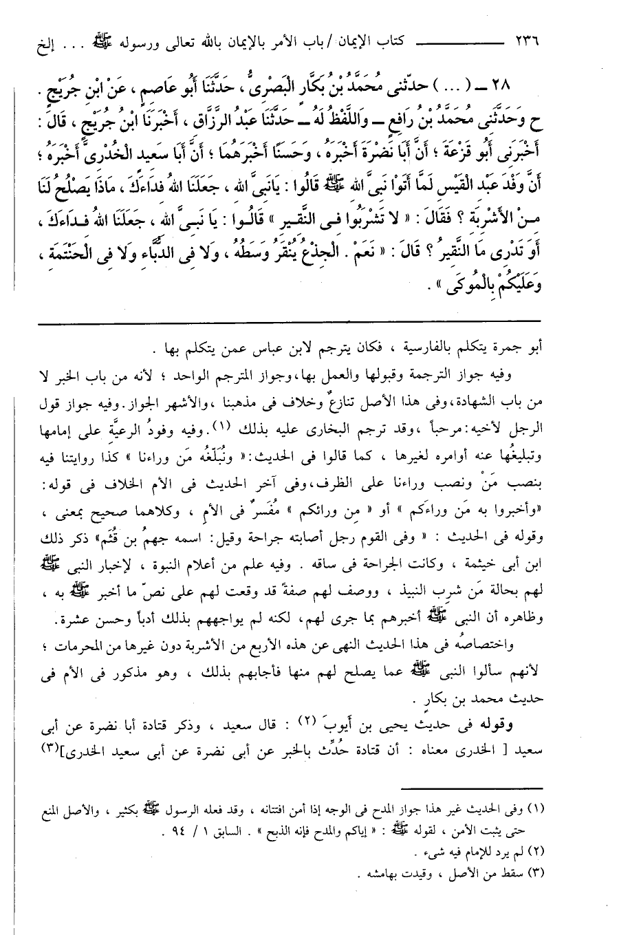 28 - (...) حدّثنى مُحَمَّدُ بْنُ بَكَّارٍ الْبَصْرِىُّ، حَدَّثَنَا أَبُو عَاصِمٍ، عَنْ ابْنِ جُرَيْجٍ. ح وَحَدَّثَنِى مُحَمَّدُ بْنُ رَافِعٍ - وَاللَّفْظُ لَهُ - حَدَّثَنَا عَبْدُ الرَّزَّاقِ، أَخْبَرَنَا ابْنُ جُرَيْجٍ، قَالَ: أَخْبَرَنِى أَبُو قَزْعَةَ؛ أَنَّ أَبَا نَضْرَةَ أَخْبَرَهُ، وَحَسَنًا أَخْبَرَهُمَا؛ أَنَّ أَبَا سَعِيدٍ الْخُدْرِىَّ أَخْبَرَهُ؛ أَنَّ وَفْدَ عَبْدِ الْقَيْسِ لَمَّا أَتَوْا نَبِىَّ اللهِ صَلَّى اللهُ عَلَيْهِ وَسَلَّمَ قَالُوا: يَا نَبِىَّ اللهِ، جَعَلَنَا اللهُ فِدَاءَكَ، مَاذَا يَصْلُحُ لَنَا مِنْ الأَشْرِبَةِ؟ فَقَالَ: " لا تَشْرَبُوا فِى النَّقِيرِ " قَالُوا: يَا نَبِىَّ اللهِ، جَعَلَنَا اللهُ فدَاءَكَ، أَوَ تَدْرِى مَا النَّقِيرُ؟ قَالَ: " نَعَمْ. الْجِذْعُ يُنْقَرُ وَسَطُهُ، وَلا فِى الدُّبَّاءِ وَلا فِى الْحَنْتَمَةِ، وَعَلَيْكُمْ بِالْمُوكَى ".